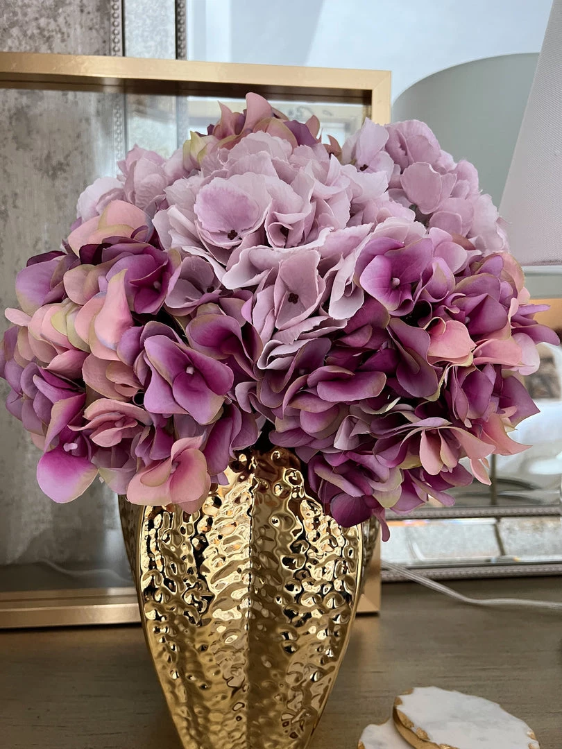 Description: This ravishing Victorian Two Tone Hydrangea Stem is the perfect accessory this season! The bright colors offer elegance to your home and the glitter adds a dazzling effect!