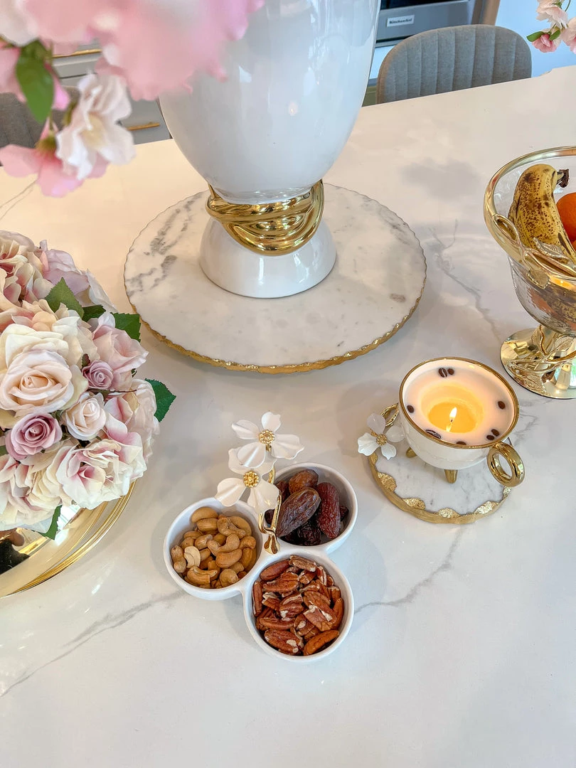 Description: This white porcelain triple snack bowl is a stunning piece for entertaining or for everyday use and features a white jeweled flower design that threads into the center.