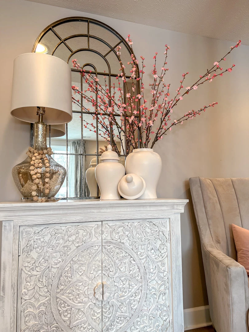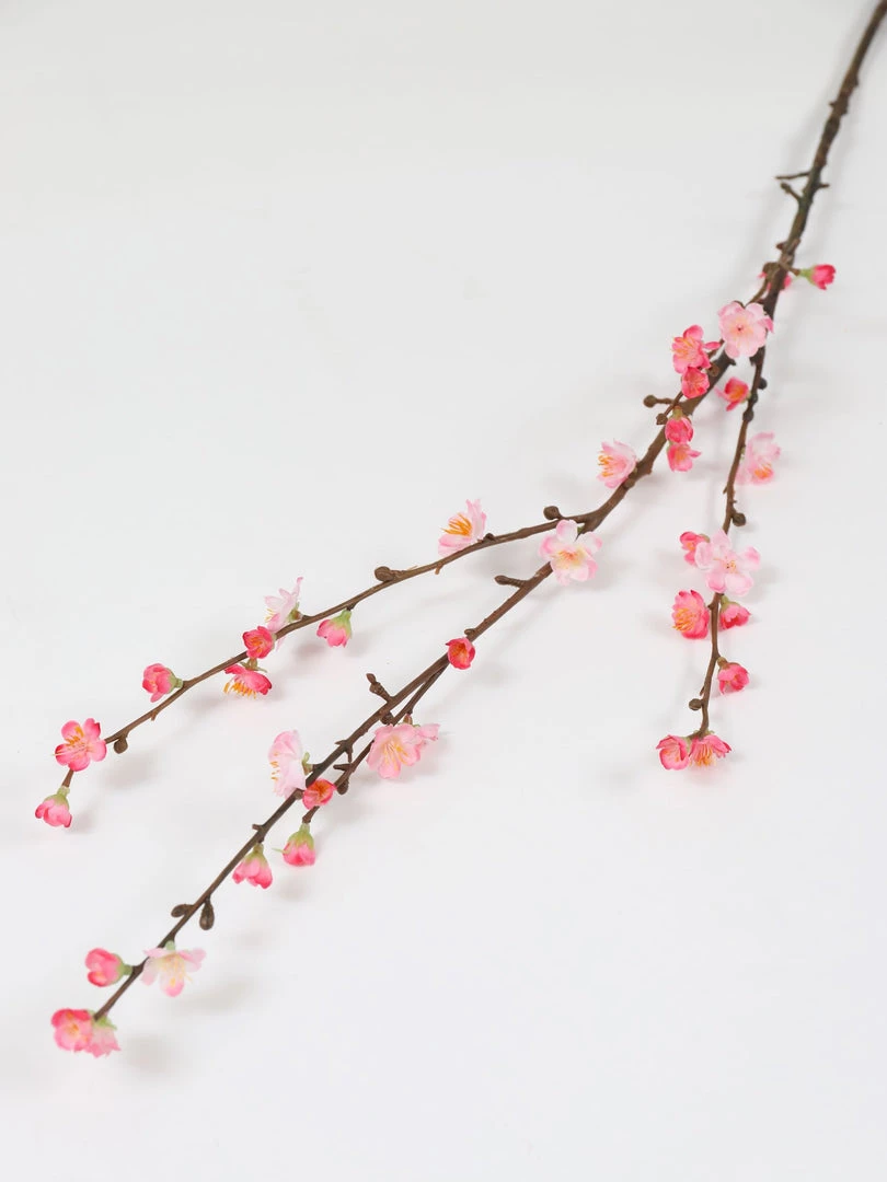 Description: This tall branch stem features stunning plum blossoms. These are perfect to style in your tall vases and ginger jars all over your home.