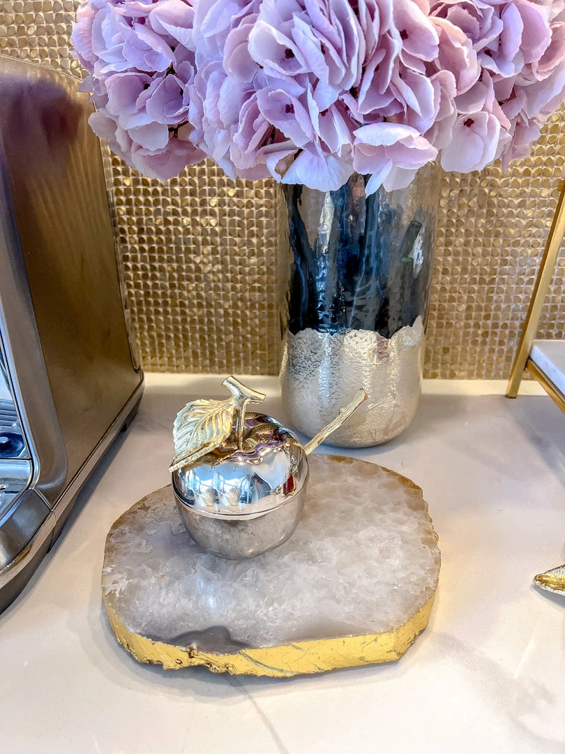 Description: This is the cutest little apple-shaped jar with a branch handled leaf spoon. Use for holding sugar or spices. Available in Silver and Gold and Silver. Individually priced.