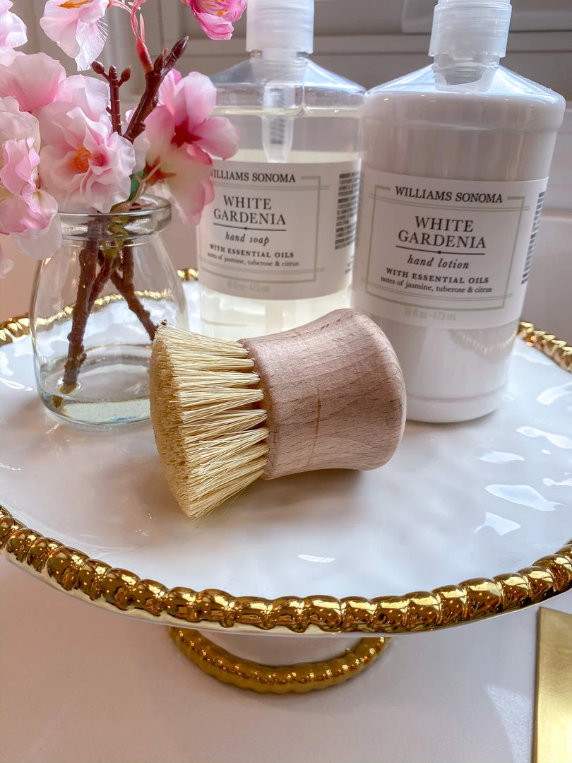 Description: This beech wood brush is the perfect addition to your kitchen sink. Elevate it with a stand with a faux floral and a candle for a lovely look.
