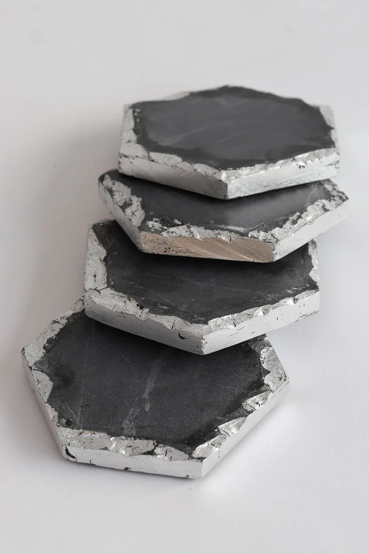 Description: These beautiful charcoal grey marble hexagon coasters are a perfect accent for your coffee table! Complete with a hammered texture edge and a metallic finish!