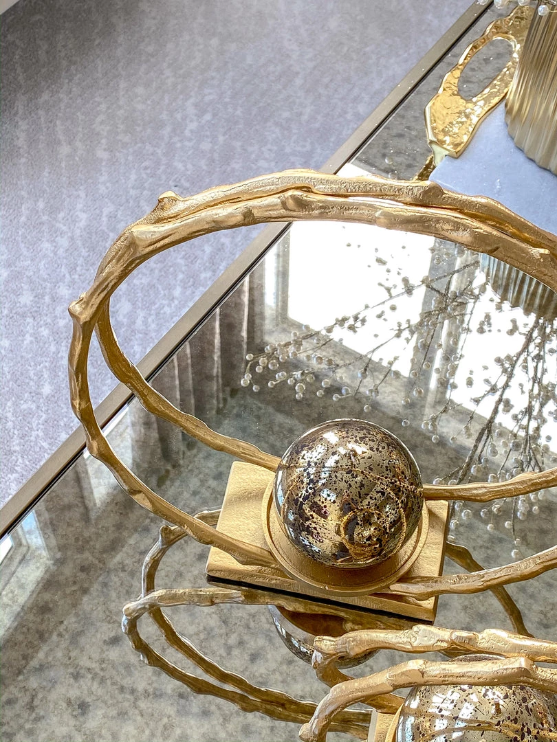 Description: Let your candles shine with this beautiful candle holder. The circular design encapsulates your favorite candles and makes them the centerpiece of your display. Featuring a gold finish and natural textures, this is a beautiful must-have for your home! Available in 2 sizes.