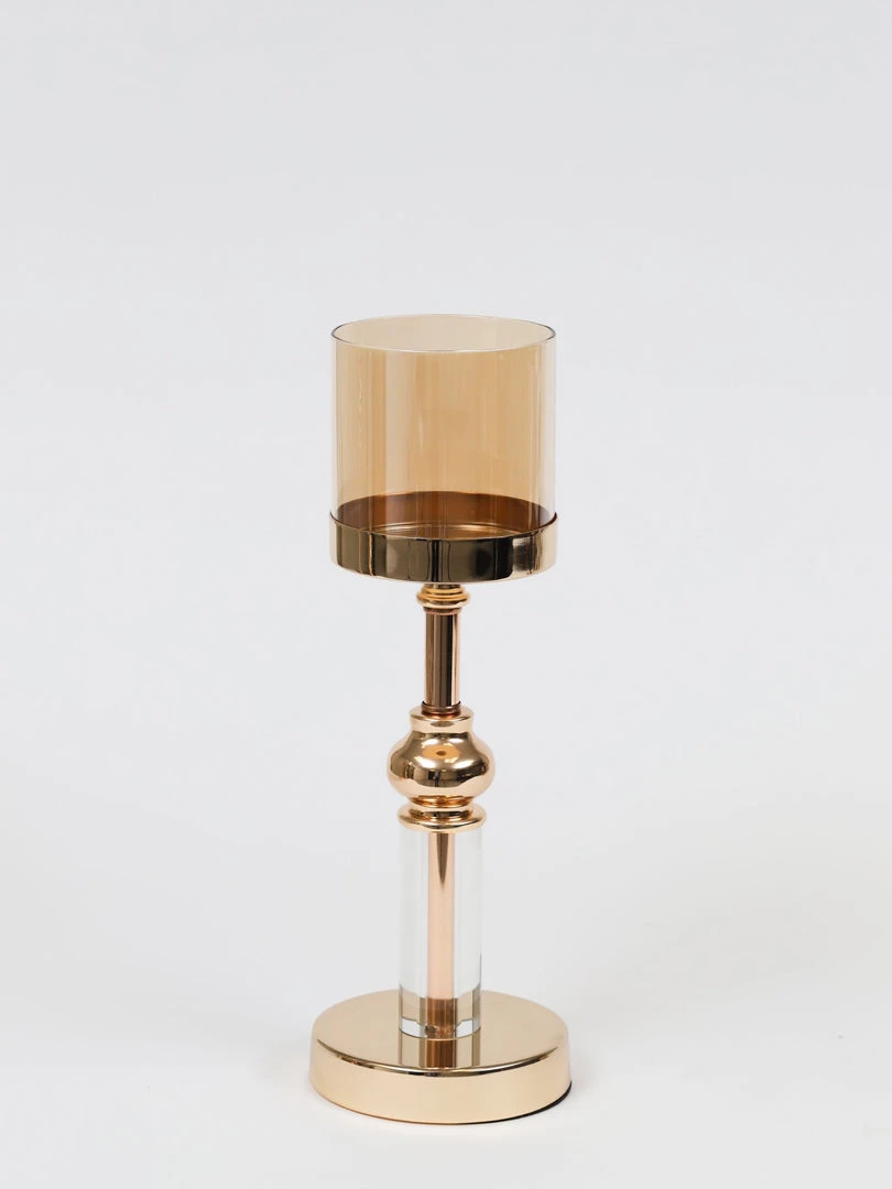 Description: These candle sticks are absolutely beautiful! We love the classic design with a modern twist, and the amber glass hurricane glass completes the look! Sold as a set of 3.