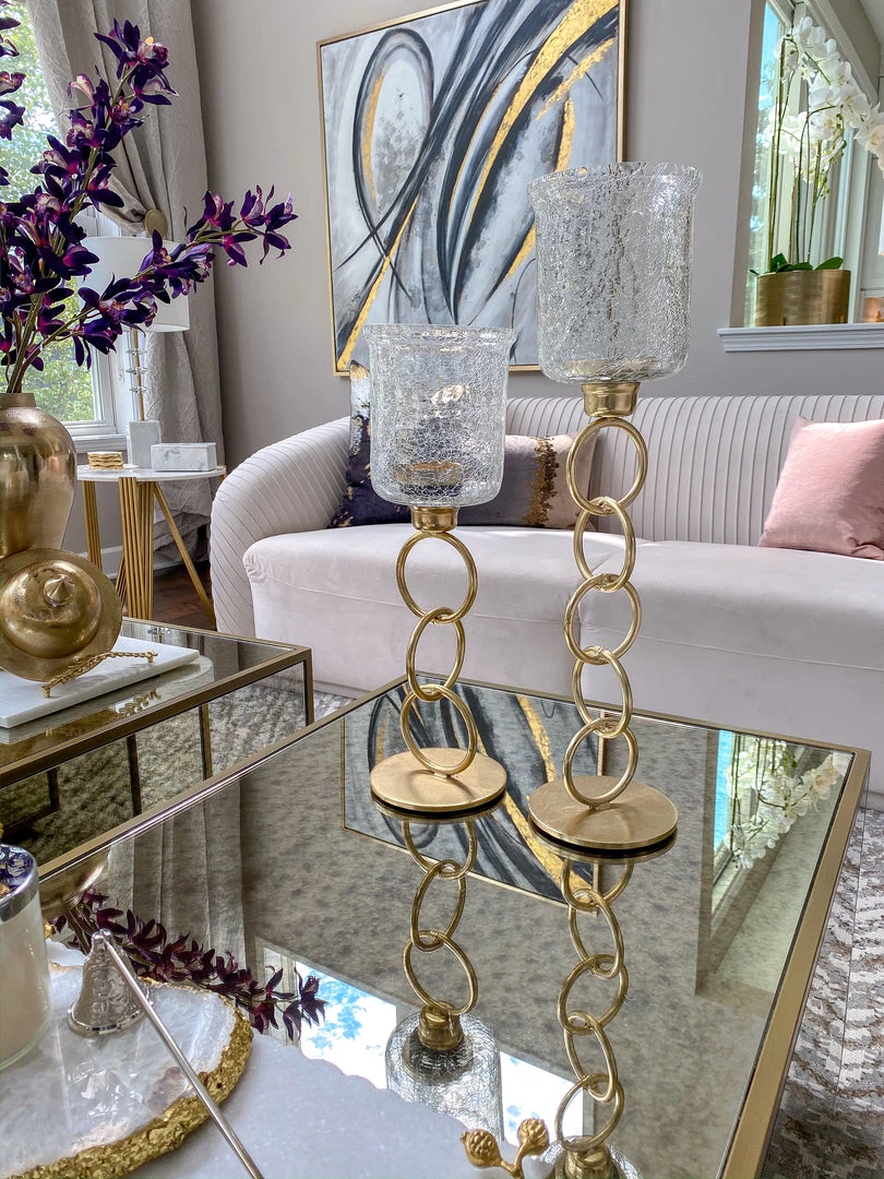 Description: These candle holders are a truly a unique piece! The design features a crackled glass pillars at the top of a metallic circle link stand. A beautiful pedestal for your favorite candles! Available in 2 sizes!