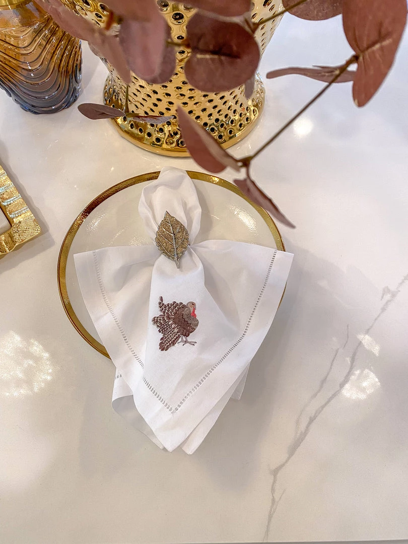 Description: These adorable napkins are perfect for your family gatherings this fall! Simple and elegant, these napkins feature a small embroidered turkey on the corner to add a cute touch of fall.