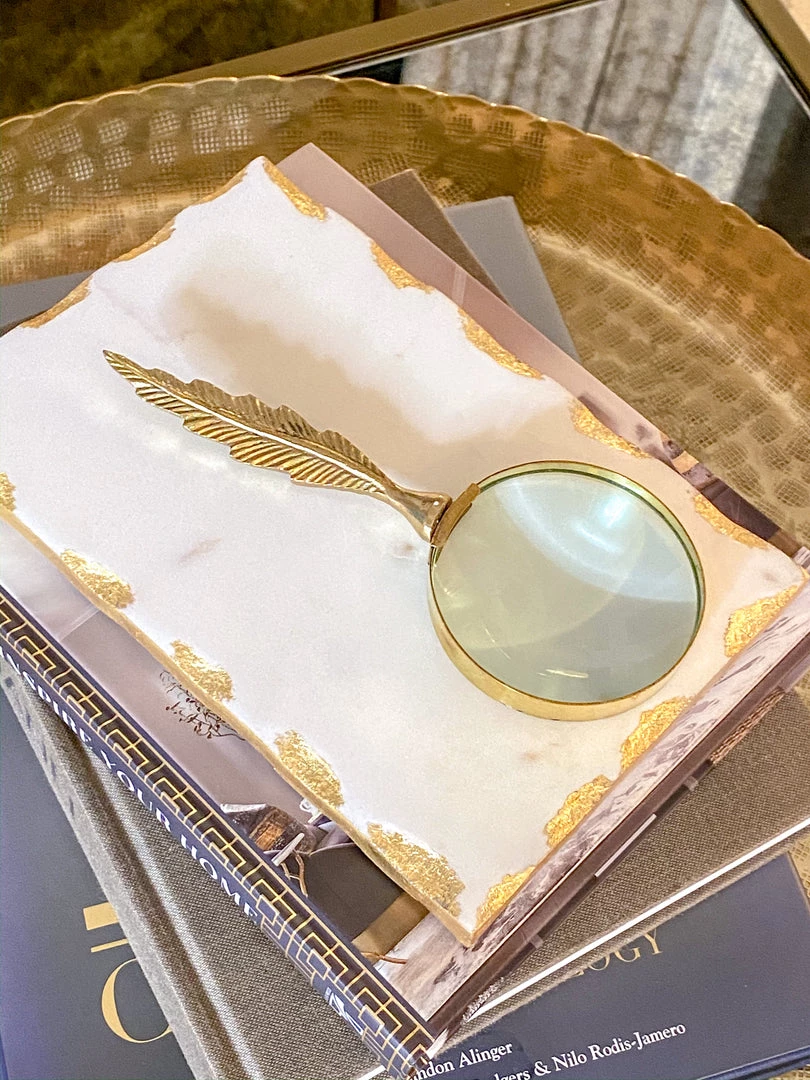 Description: This gold, feather magnifying glass adds glamour to your display.