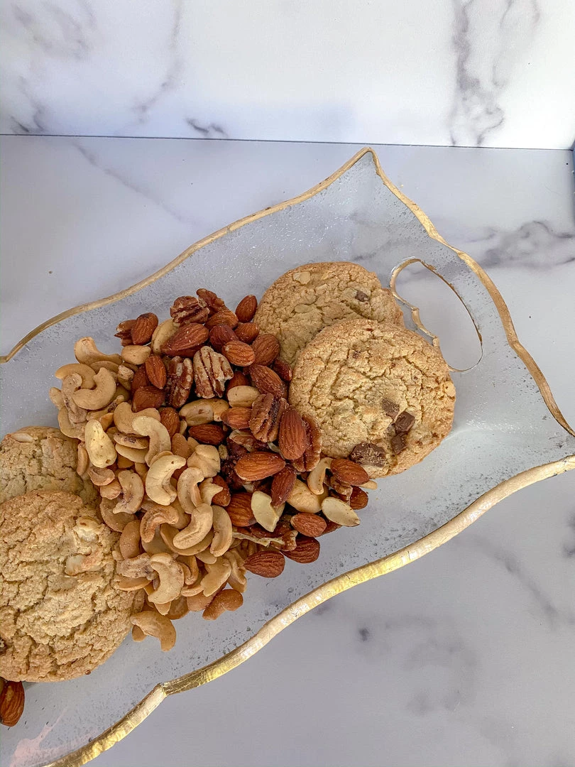 Description: Handcrafted glass serving dish with gold edging to add elegance to snacks and decor!