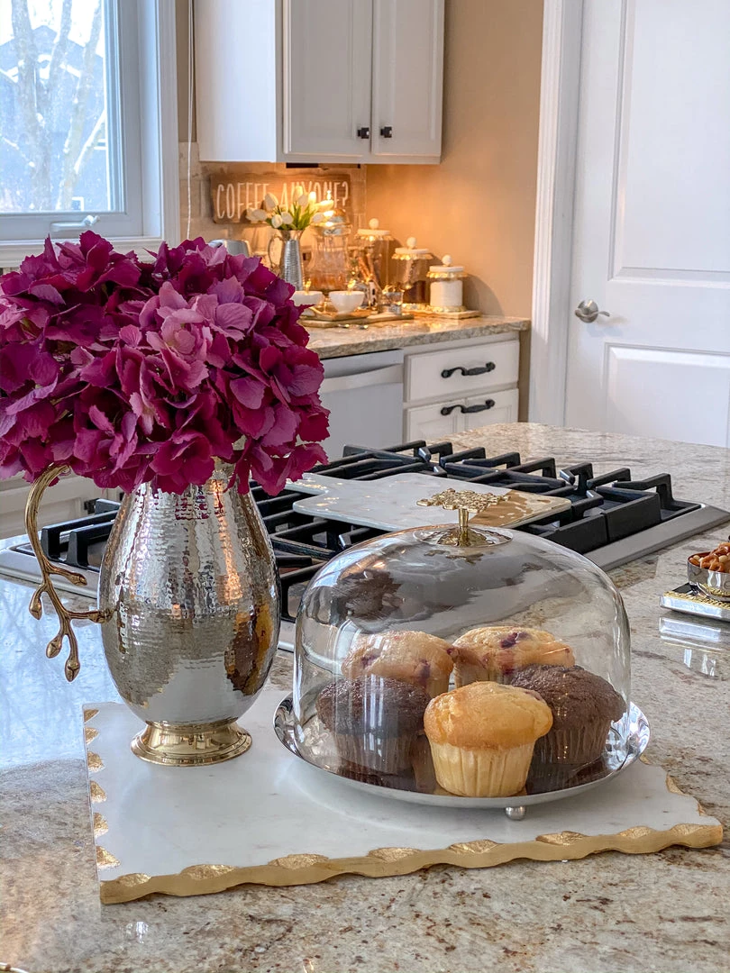 Glass and metal cake dome with gold mosaic handle matches perfectly back to your Hammered Lid Glass canisters along with your other mosaic pieces from the collection.