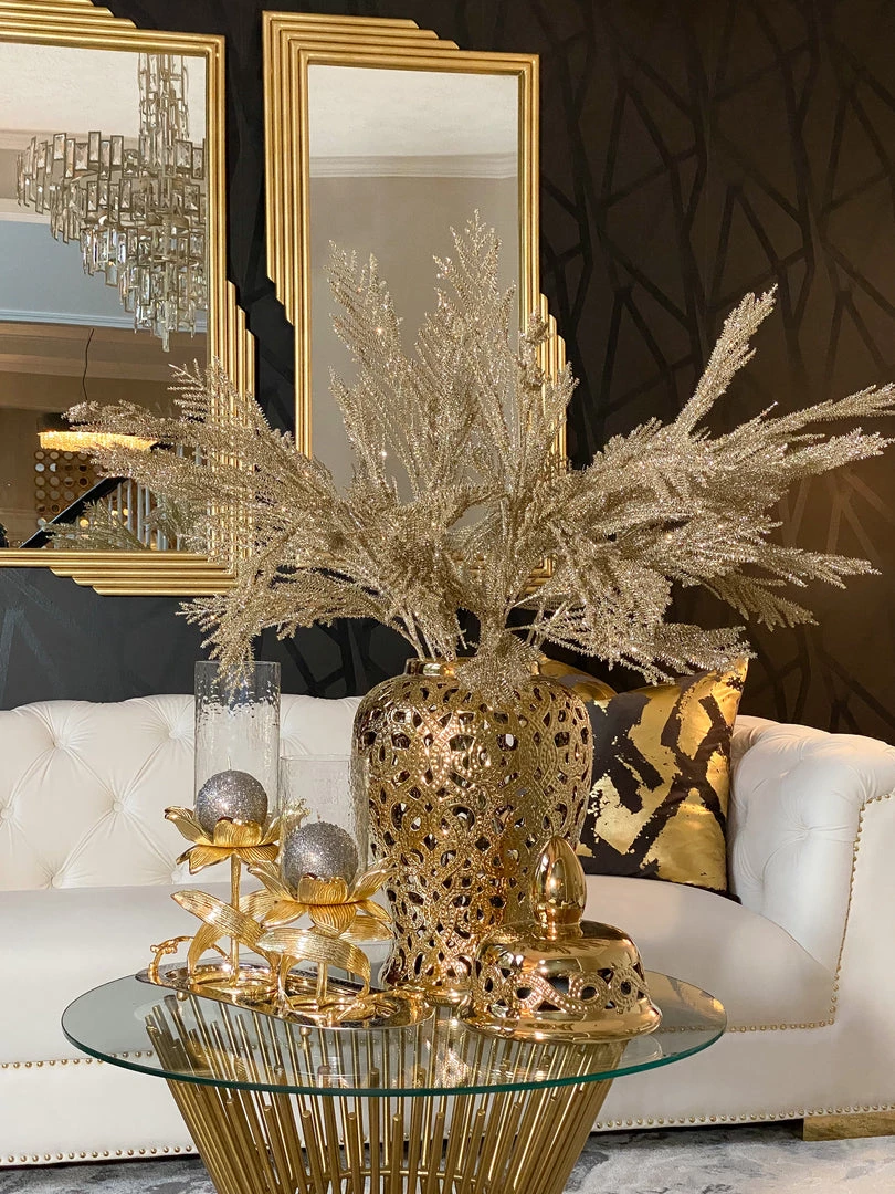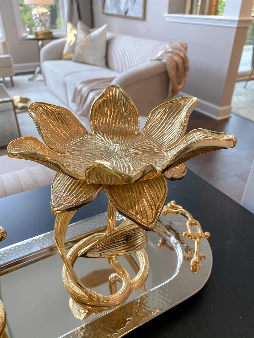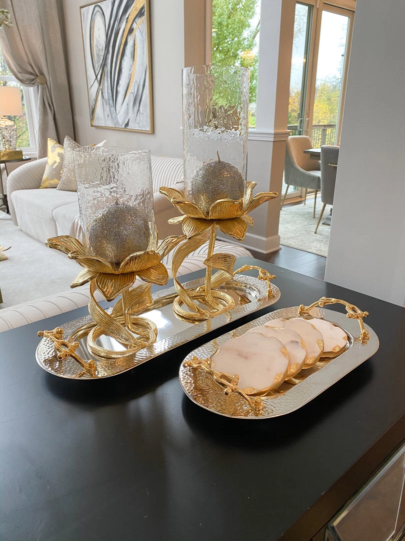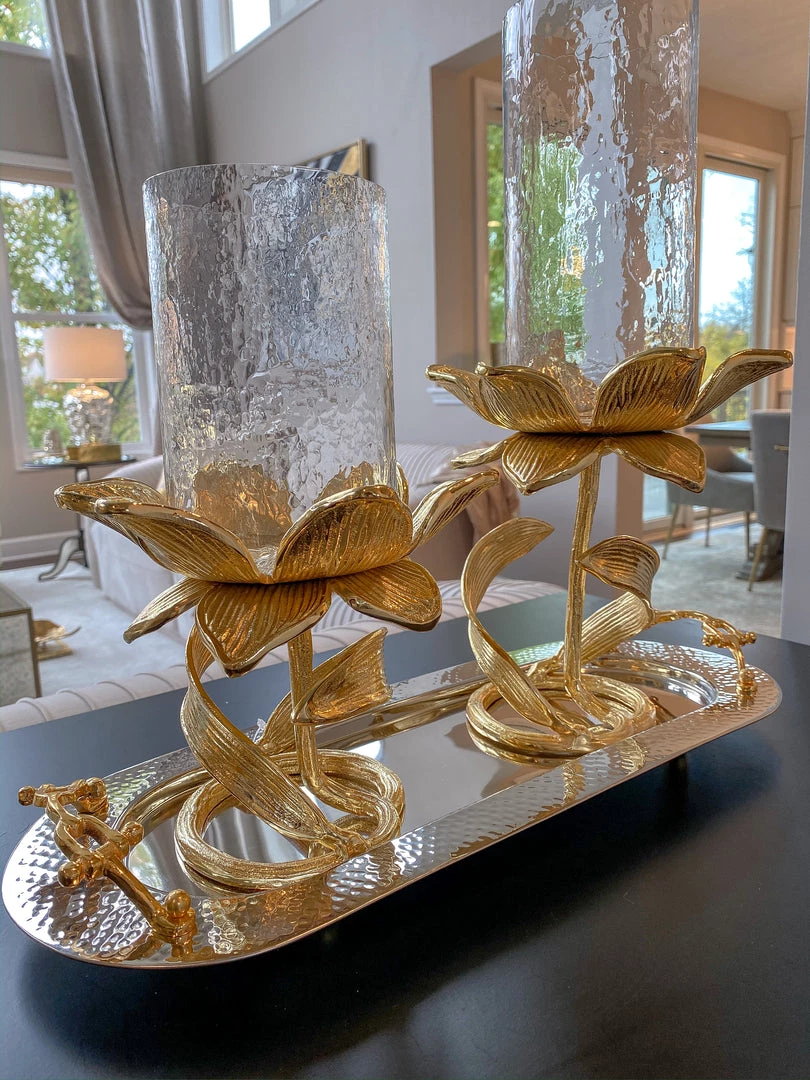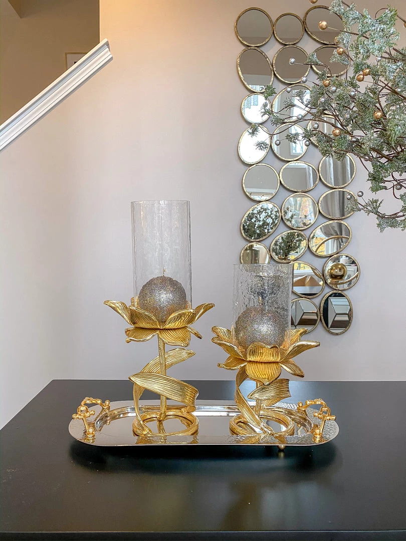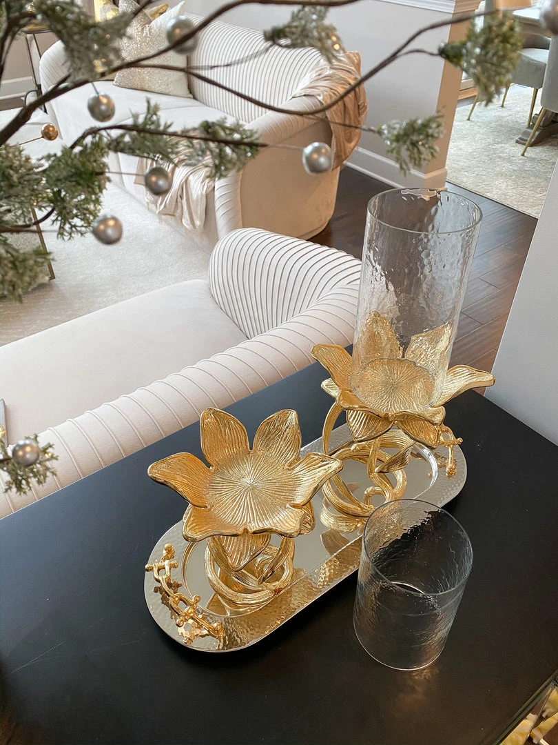 Description: Glass candle holder on a gold floral stand for a stunning candle display all year round!