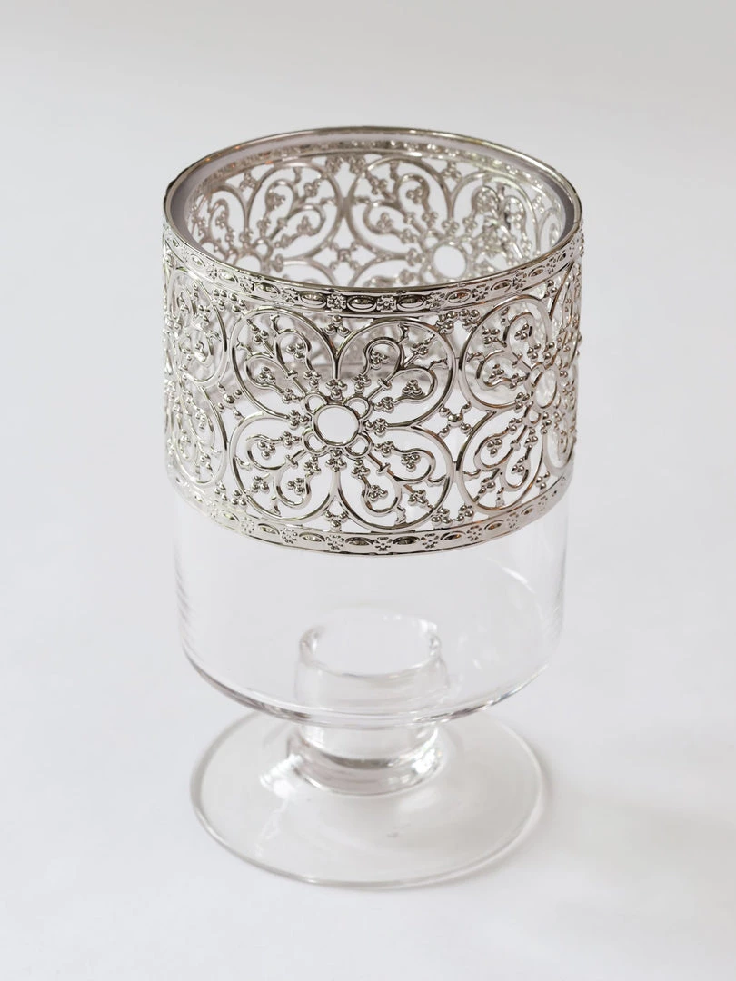 Description: This beautiful glass stem vase features a stunning detail. An ornate silver metal rim accents the piece and elevates the entire design.