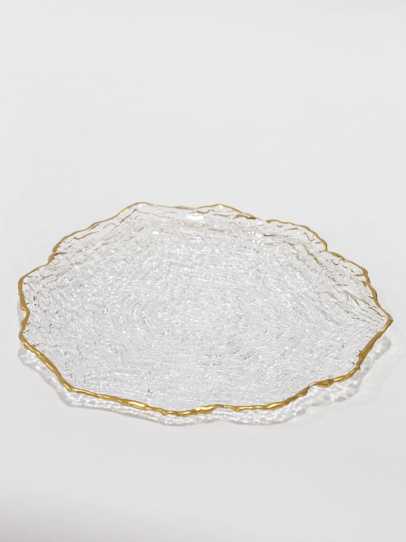 Description: This dinner plate features beautiful textured glass and a delicate gold trim to add to your serving experience! Use it to serve your favorite snacks or as a base to display for your beautiful home decor accessories!
