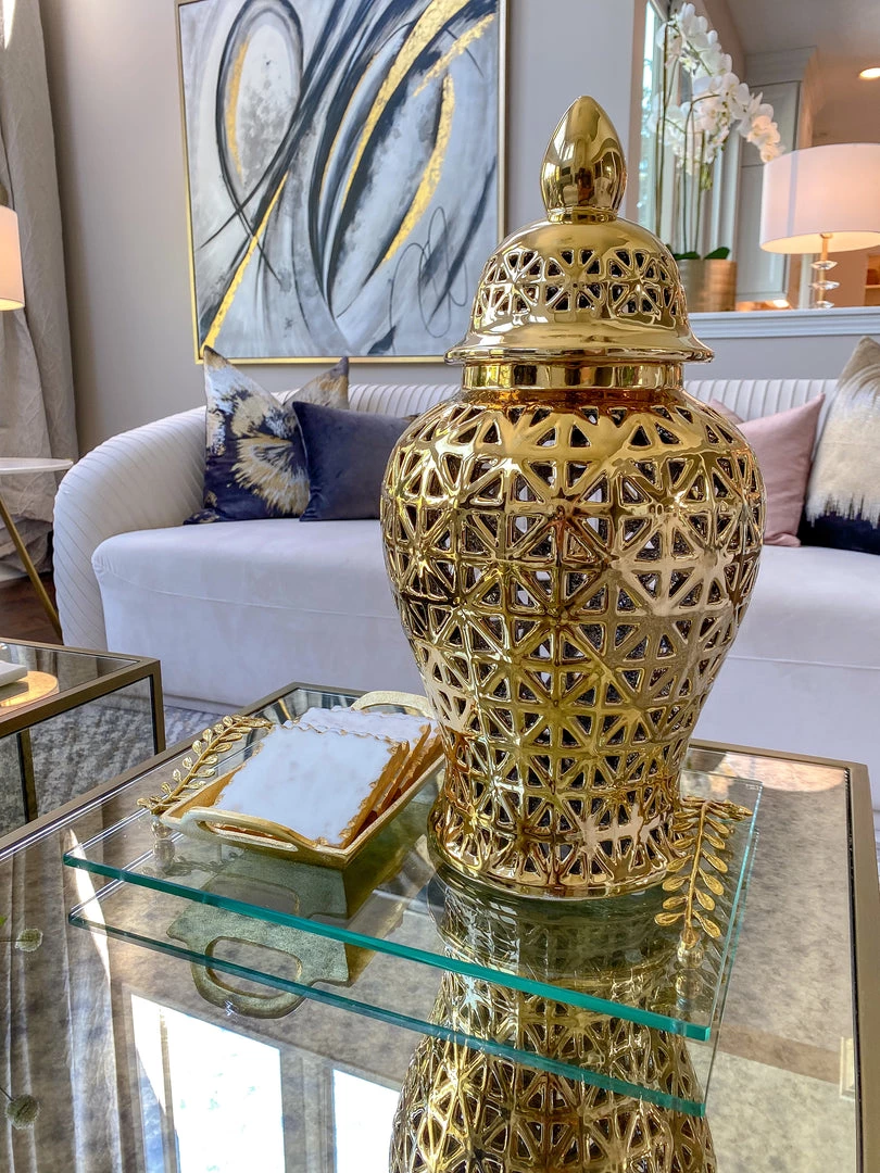 Description: This substantial glass tray features beautiful metal handles with a unique vine pattern.