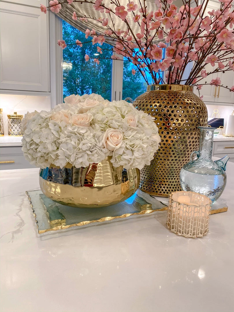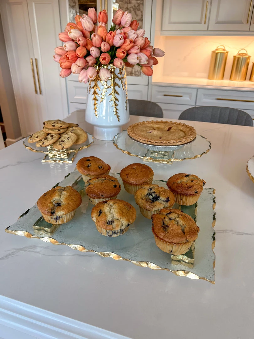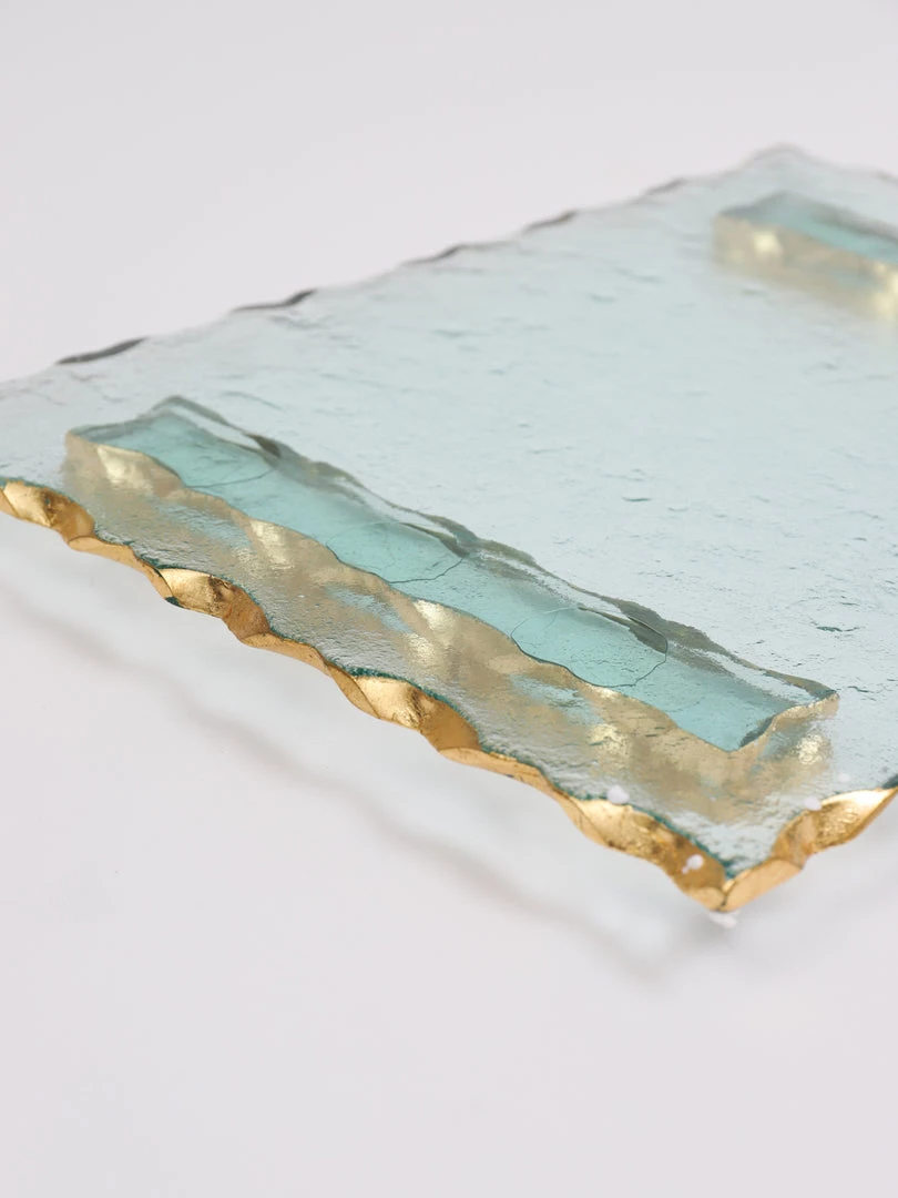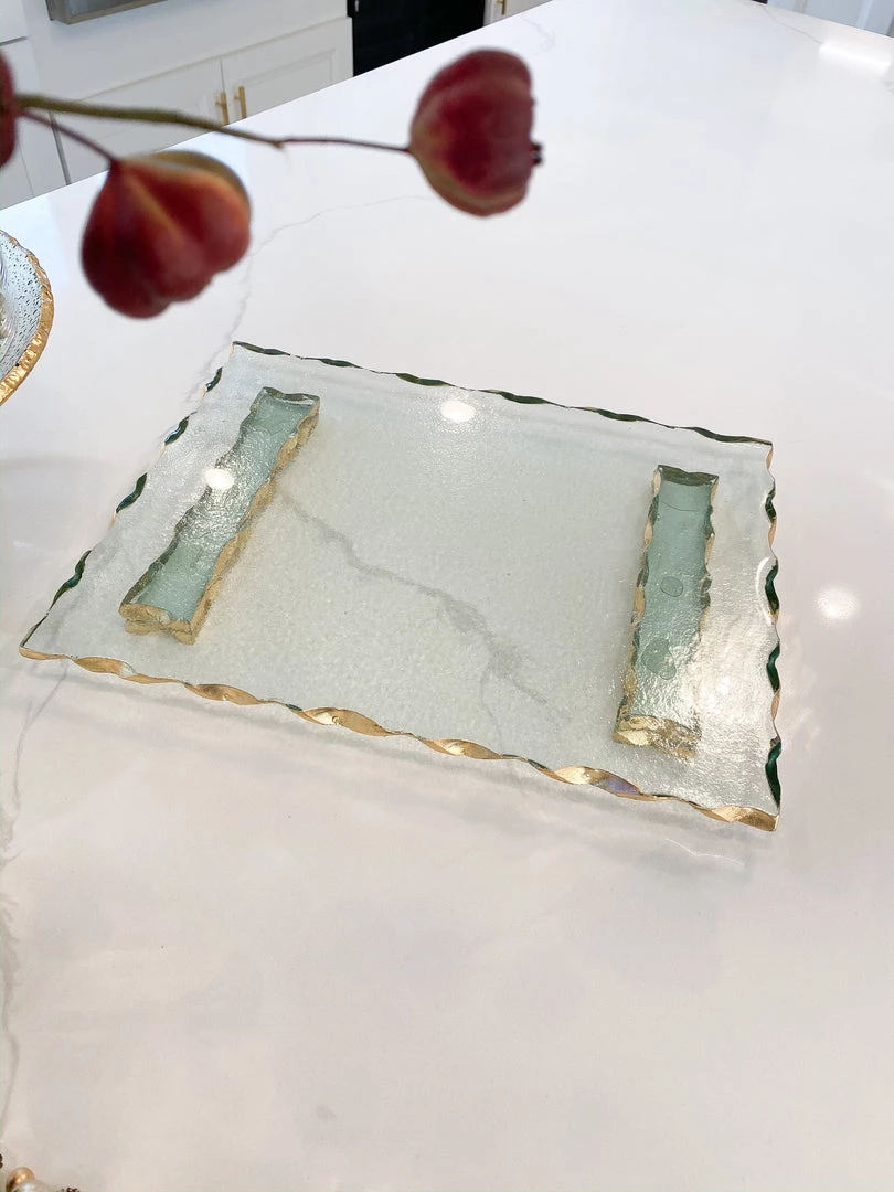 Description: This glass tray features beautiful gold edging to elegantly display your decor.