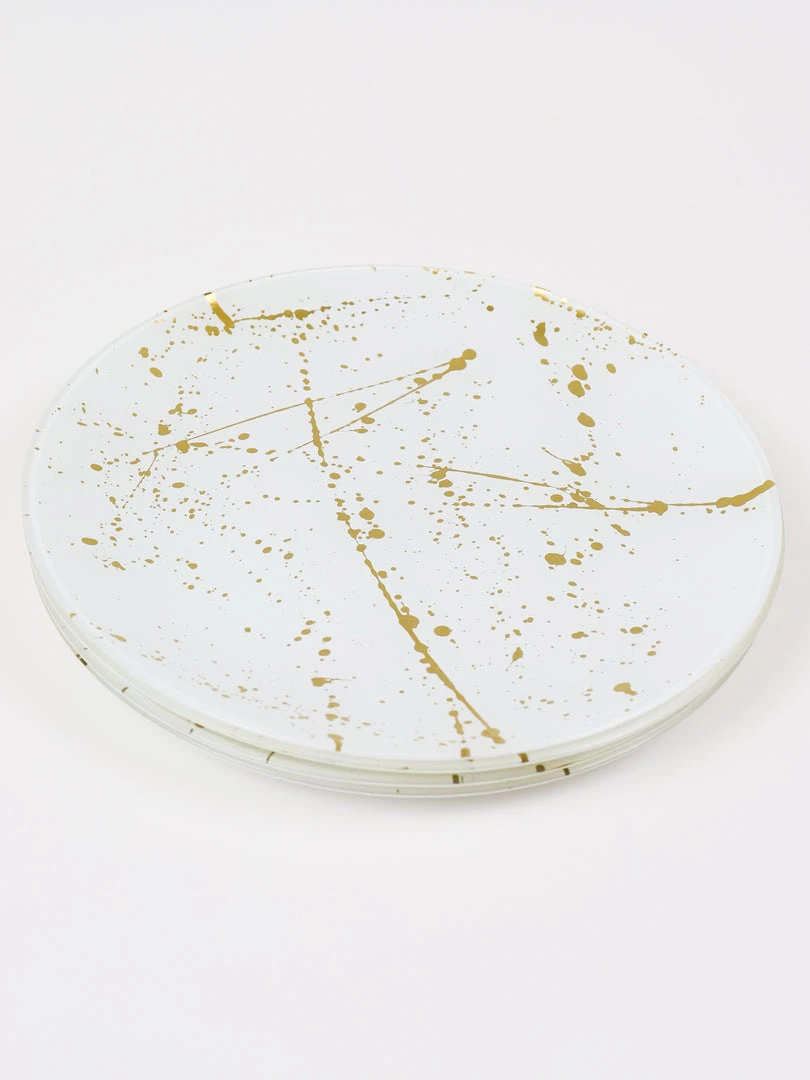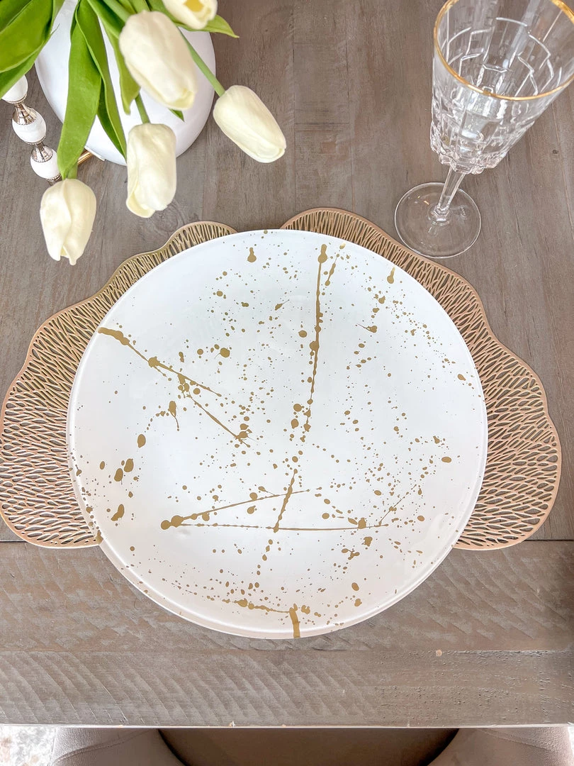 Description: These Chargers have a fun gold speckled design and will add some glam to your dinner setting!