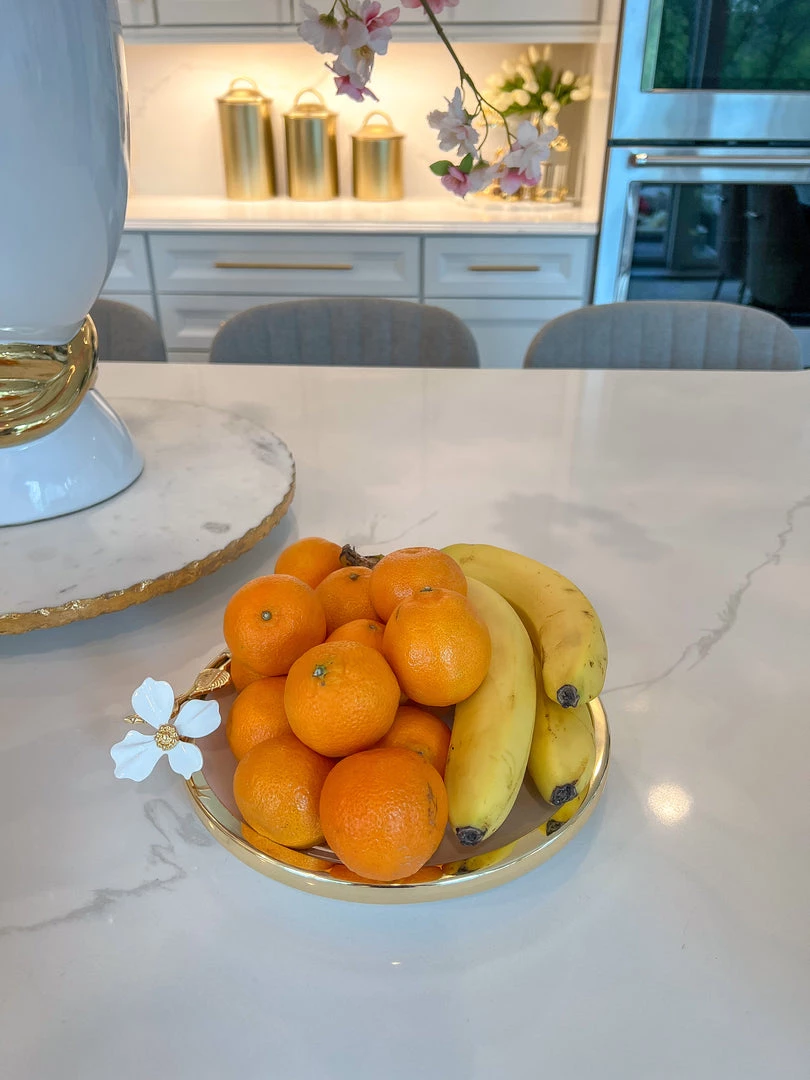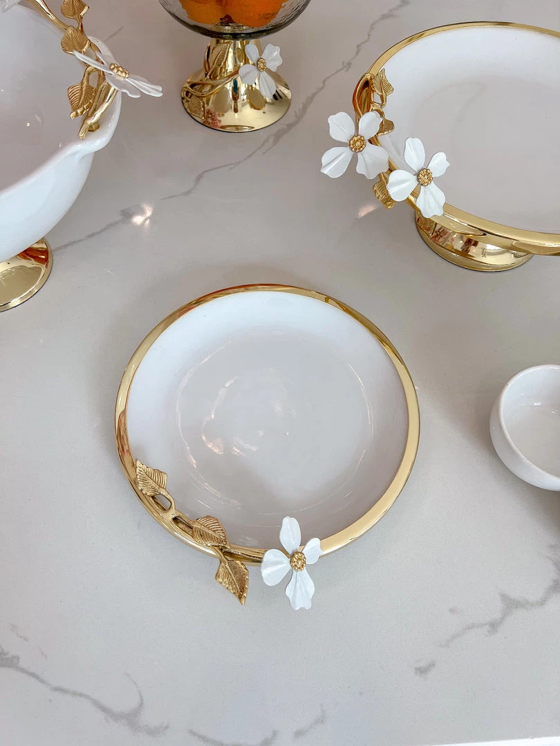 Description: This round porcelain plate is perfect for serving your favorite snack or cake or use it to style your favorite candle. You could use this as a jewelry holder as well.