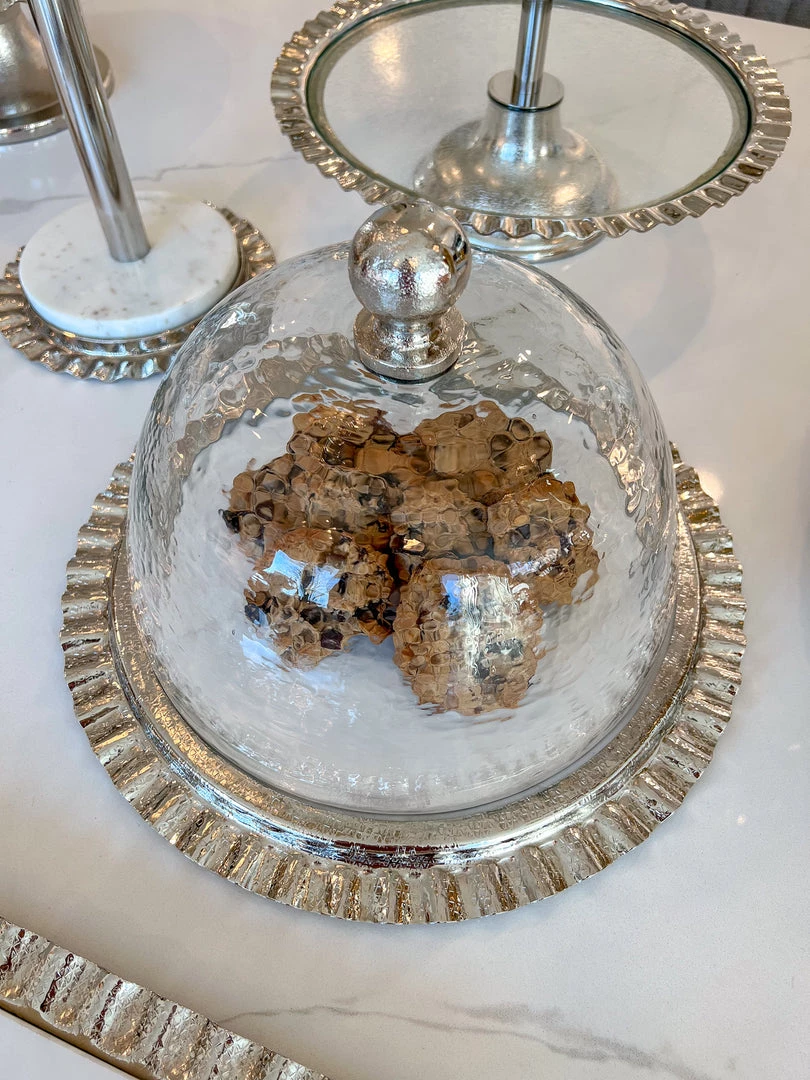 Description: Serve up some style with this dome cake stand! The glossy finish looking dazzling on the ripple textured details, and the textured glass dome looks striking. The whole structure rests on a stunning marble base for an elegant and timeless design!