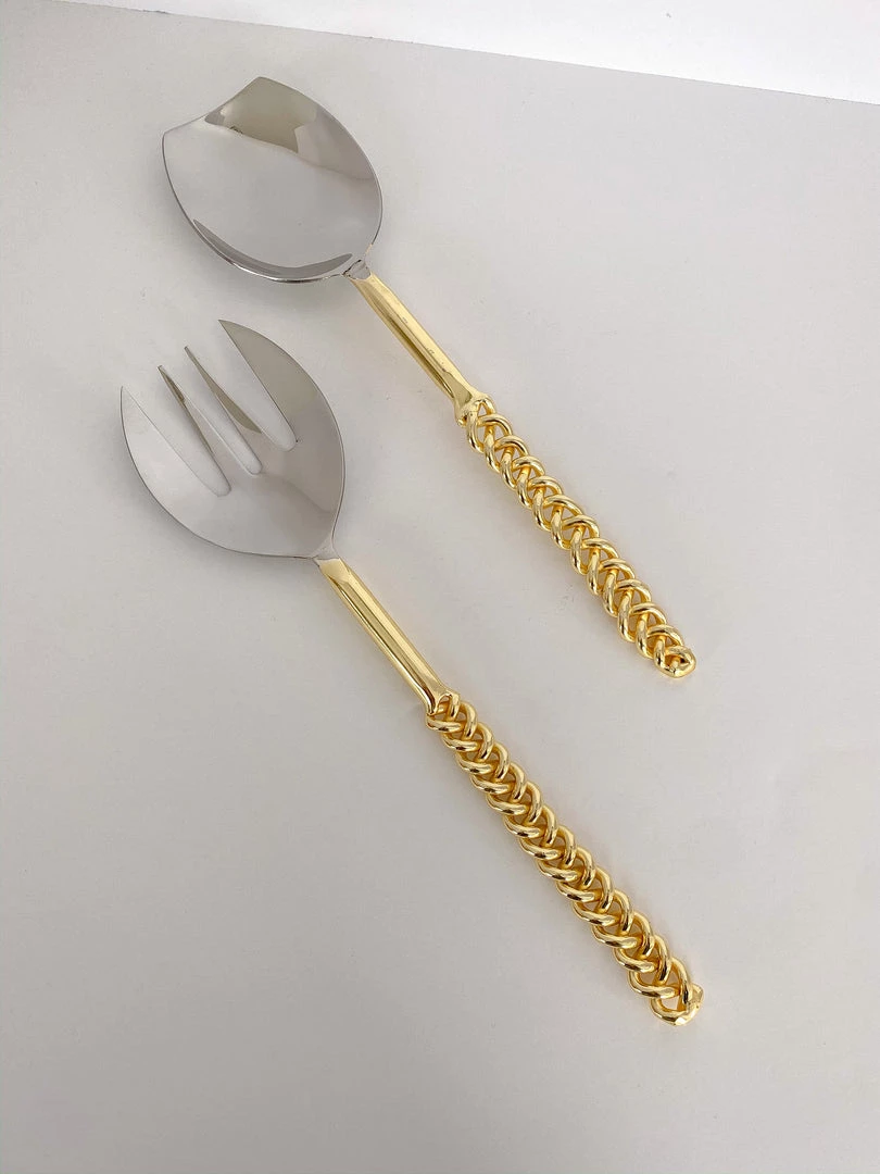 Description: Add some texture to your serving decor with these two-toned gold chain salad servers! These pieces are stunning modern additions to your glam decor!