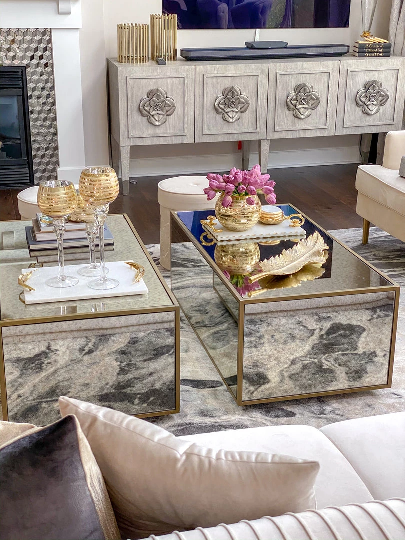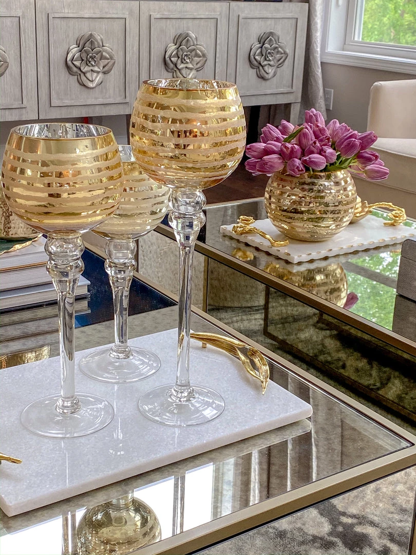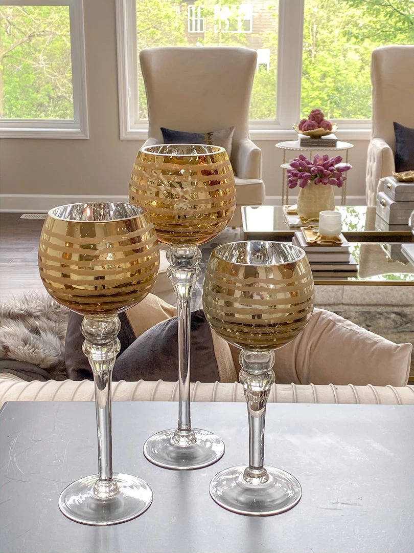 This set of 3 goblet set is an elegant gold color and features striping details. It will give your decor nice layers and and an interesting focal point.