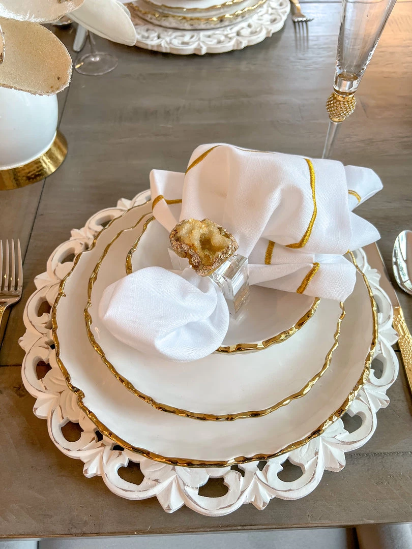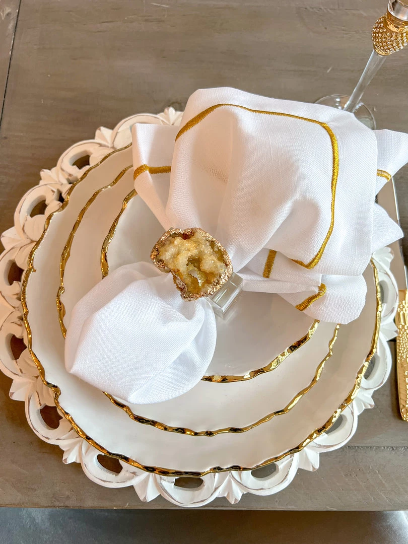Description: Add some sparkle to your table with these gorgeous acrylic napkin rings with a golden geode floating on top. These will definantly make a statement!