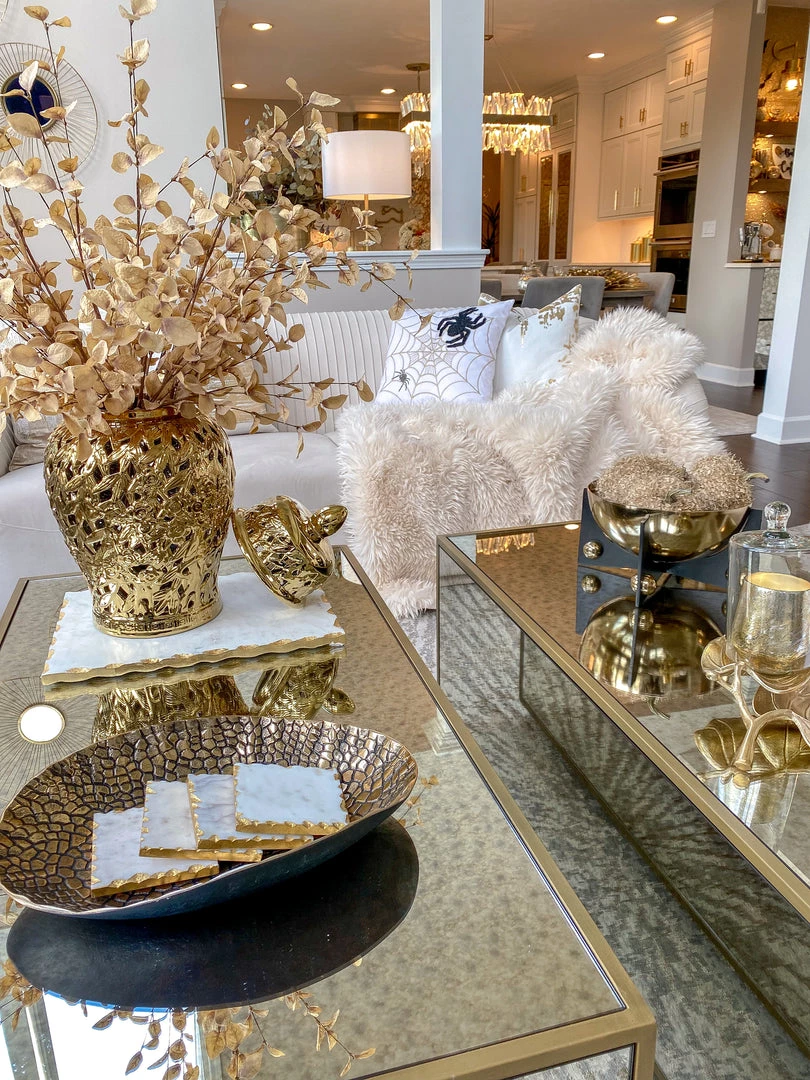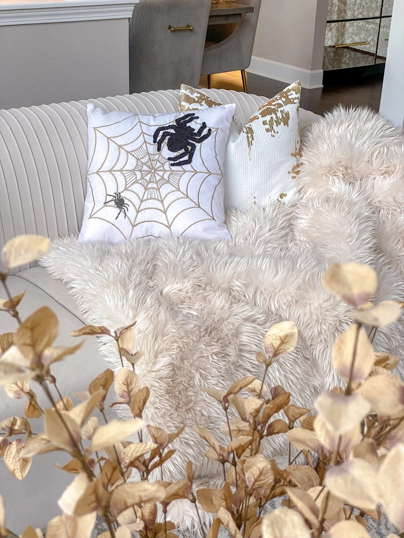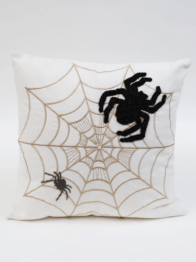 Description: We have the perfect pillow just in time for Halloween! This spooky design features beaded spiders and gold embroidered web for a stylish look. Perfect for spooky season!