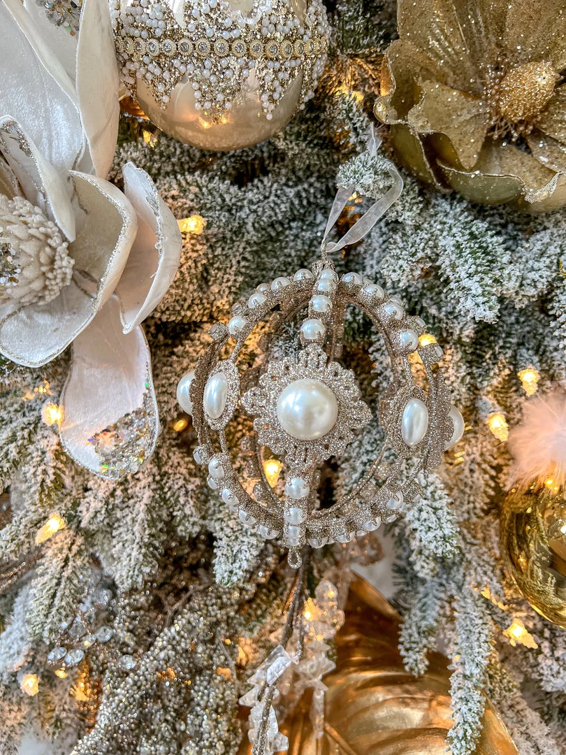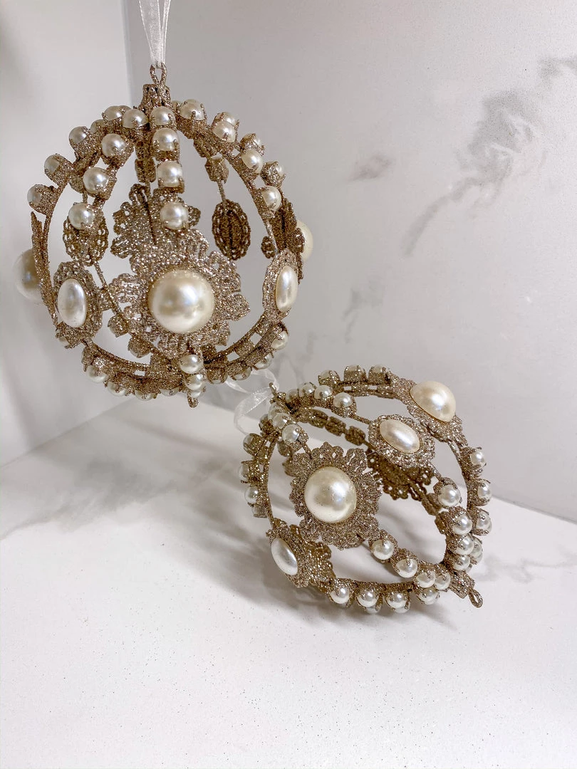 This champagne ornament with accents of faux pearls is the perfect elegant statement of decor for your tree or Holiday decor!