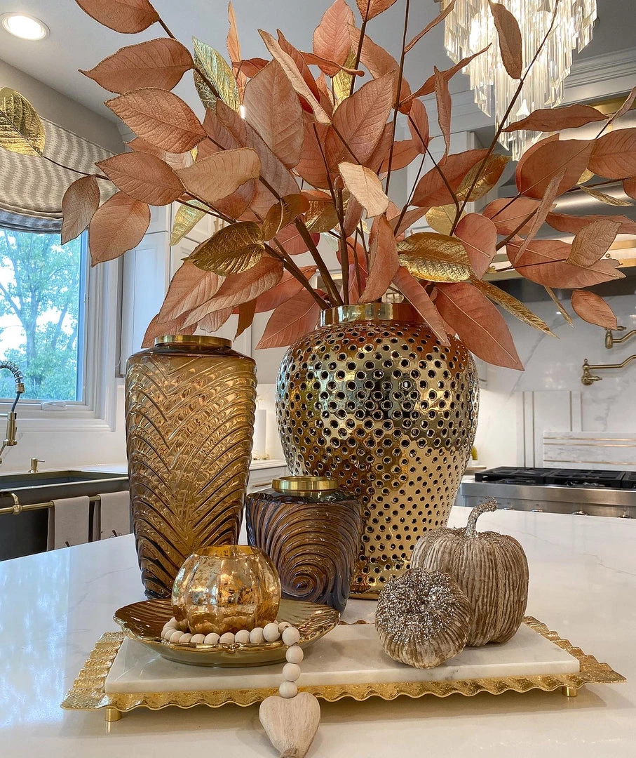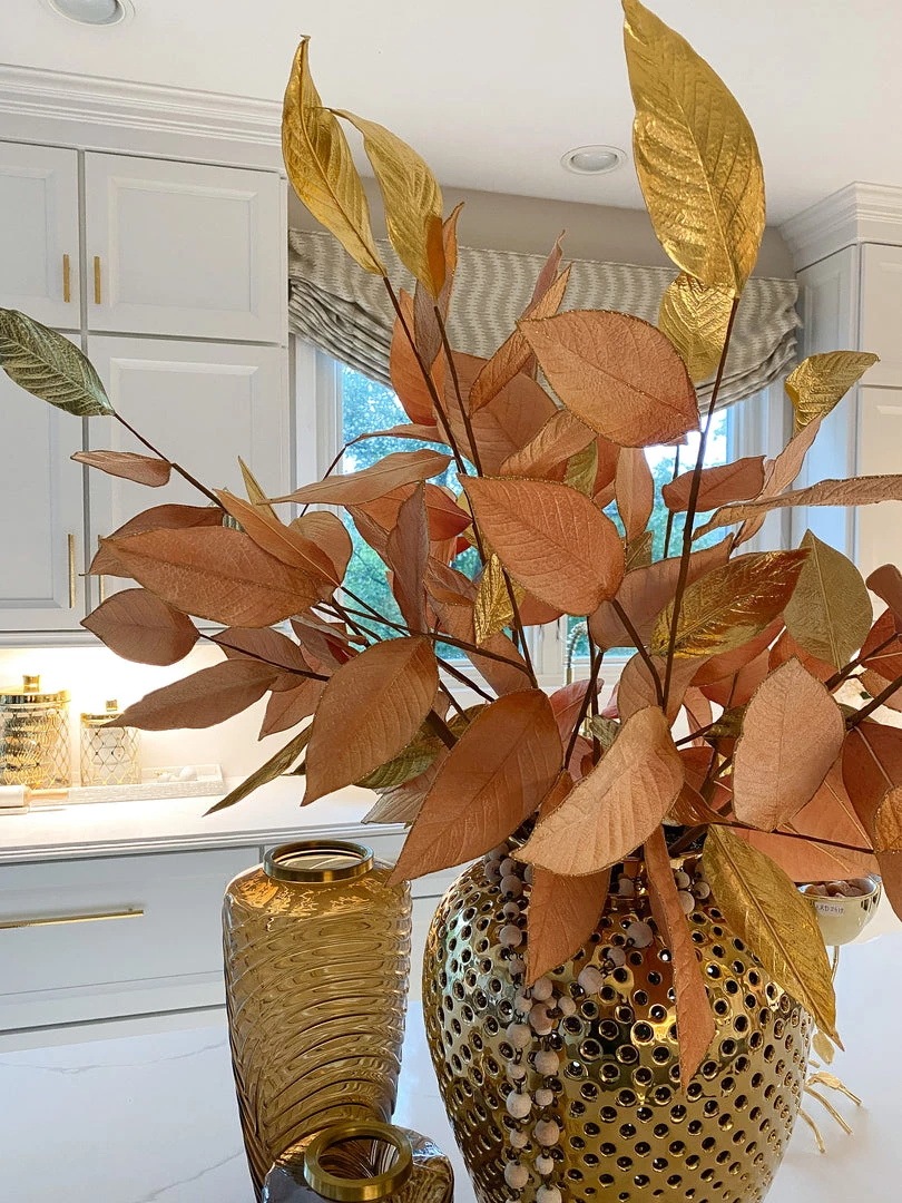 Description: This gold magnolia stem is the perfect stem to add to your tree or to a faux floral arrangement to add a natural feel to your decor. The mesh leaves give a translucent feel that is just beautiful.