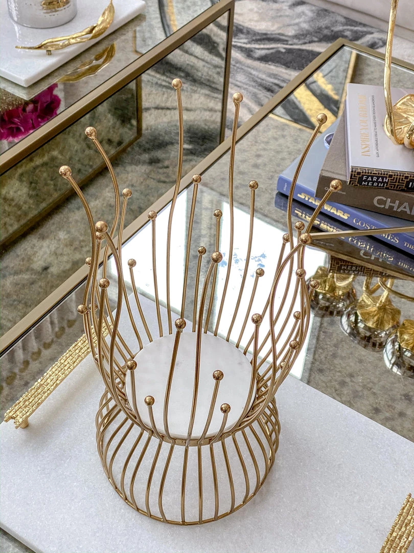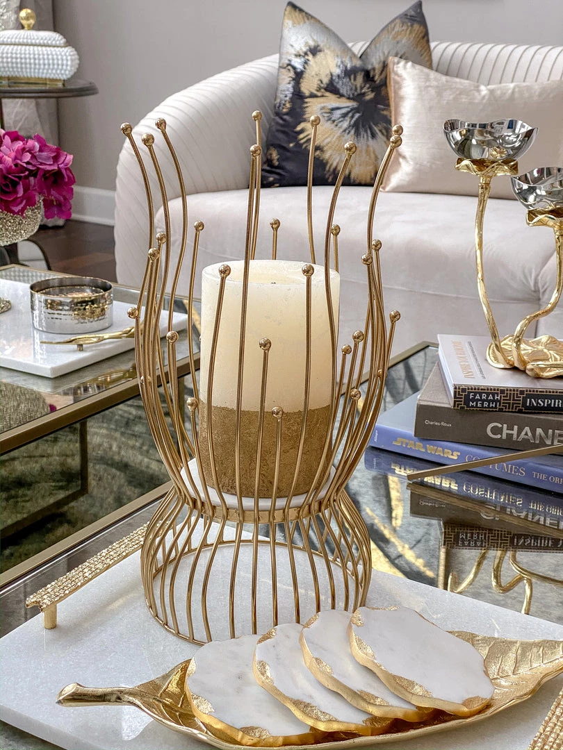 This gold hurricane candle holder is perfect for the centerpiece on your table or can add some interesting texture to your home.