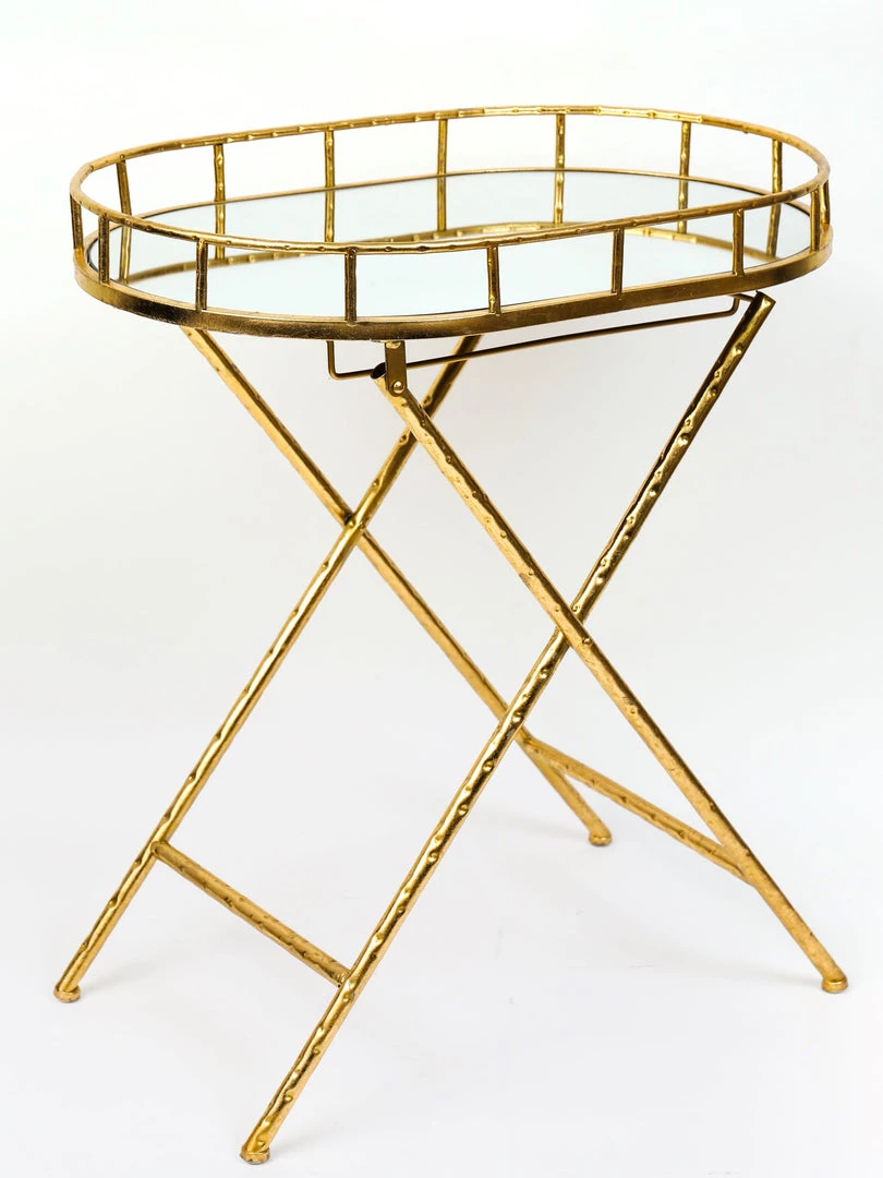 Description: Another one of our FAVS! We love the design of this oval gold tray side table. This easily folds down for storage. Use for a tea or coffee station. This is a gorgeous and versatile piece of home decor!