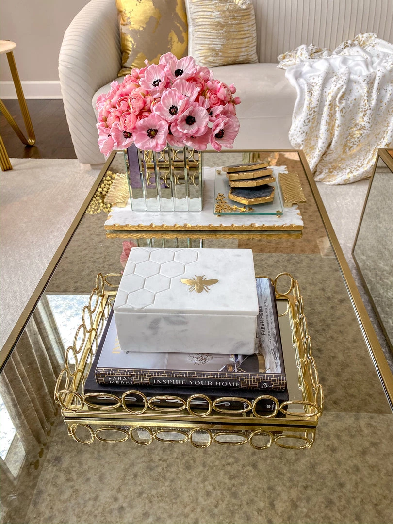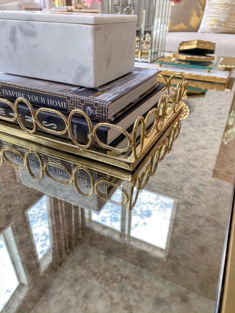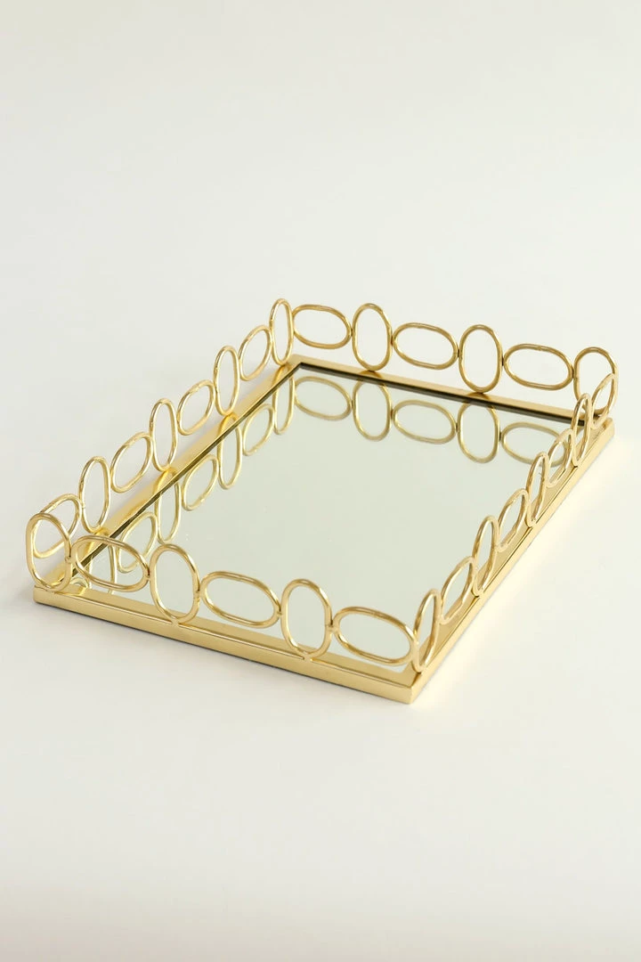 Description: This mirror glass tray is finished with gold oval accents and adds a new element of light and texture to your home!