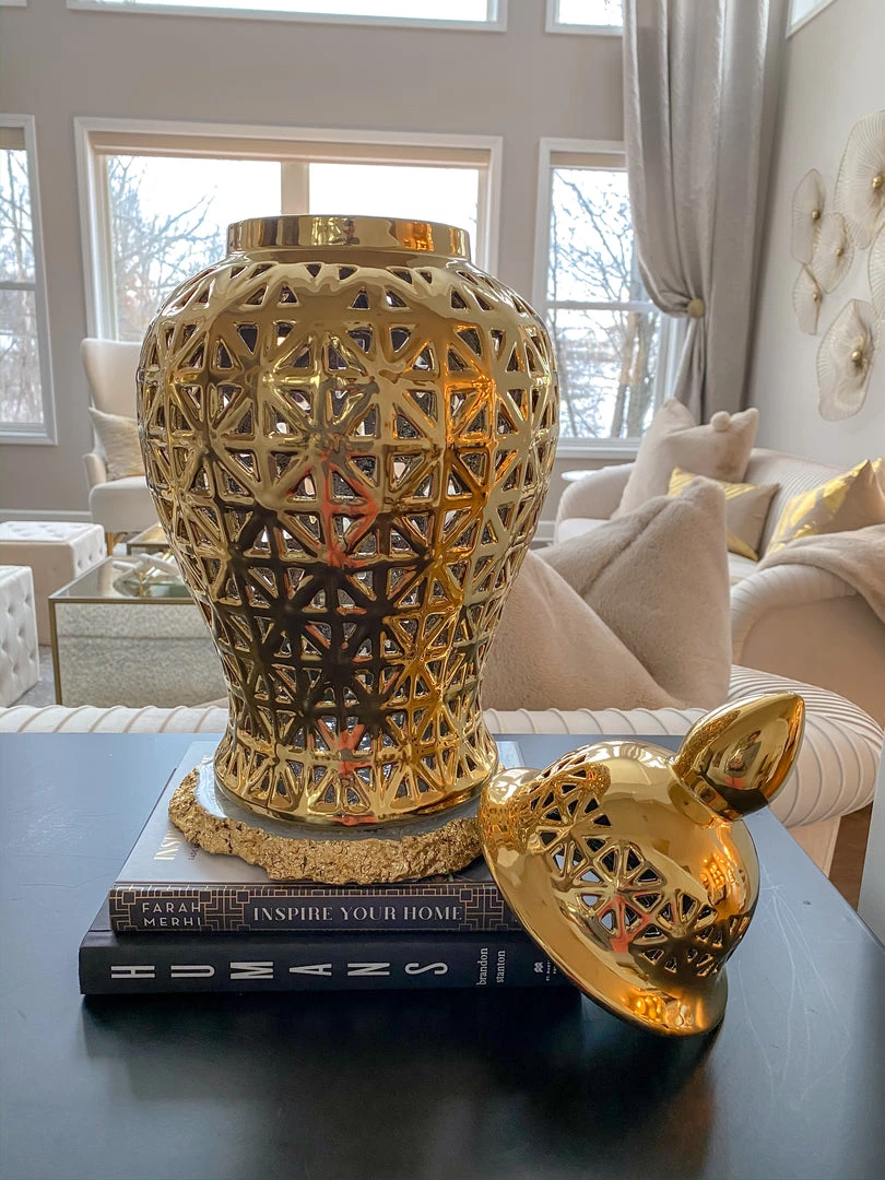 Descriptions: Ginger jars are an easy way to add unique elegance into your home decor! This gold ginger jar will look beautiful styled with your favorite flowers, or on its own display.