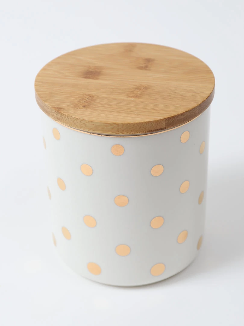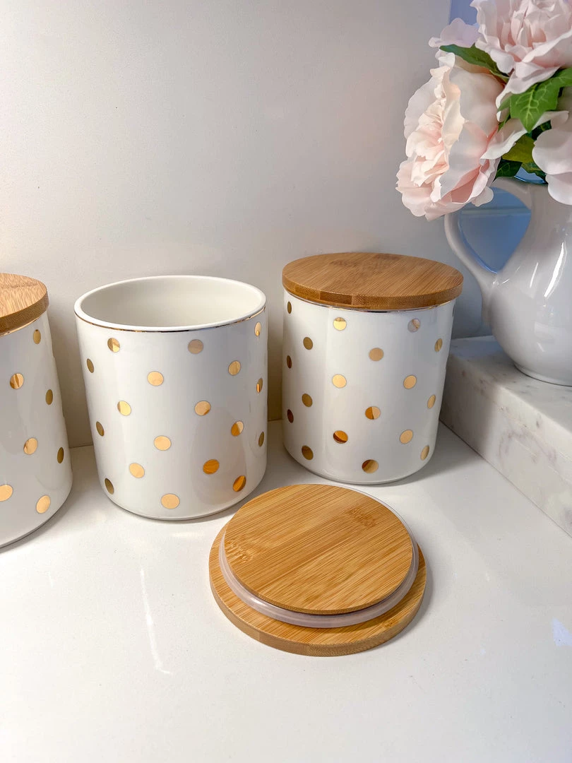 Description: The is a versatile white canister jar with a wooden top and can be used for so many things, cookies, snacks, dog treats, you name it! and it will look so cute! Each sold separately.
