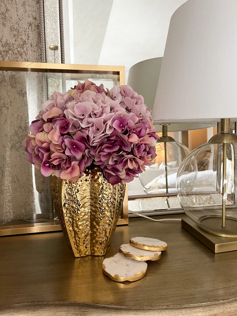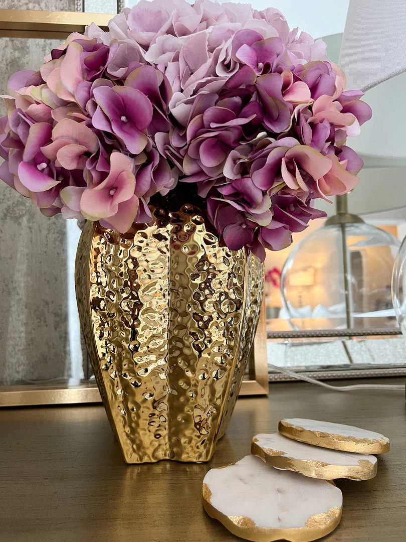 Description: These stunning gold vases are a fun shape and look so beautiful with your favorite faux florals!