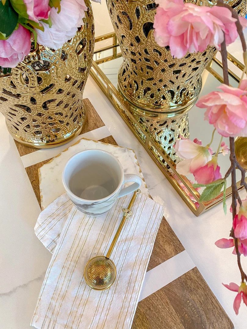 Description: This beautiful gold tea egg is the perfect tool for that perfect cup of tea! Simply push the handle to open the tea egg, insert your favorite bag of tea, set it in your cup and enjoy!