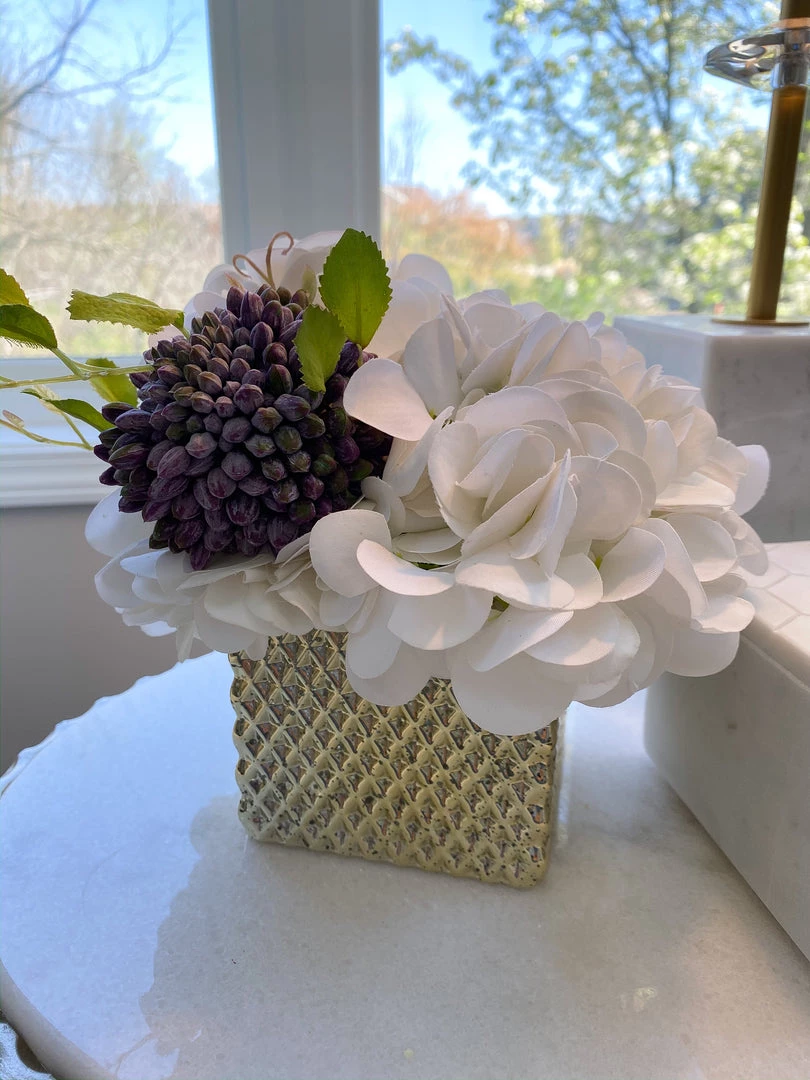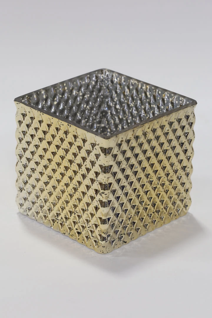 Description: This squared vase will make a perfect addition to small floral arrangement! The shiny gold finish and studded texture add to the supreme elegance of this piece!