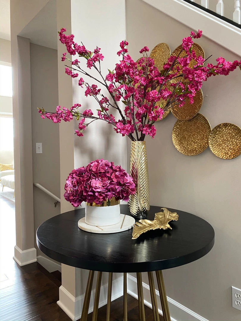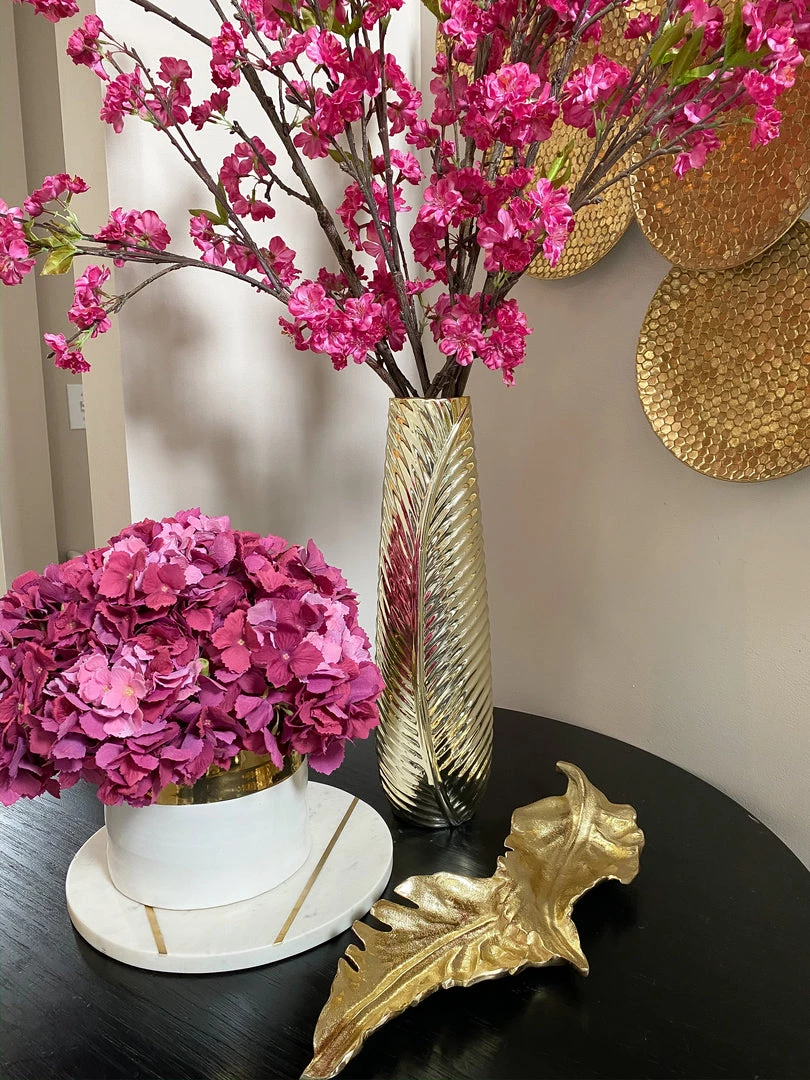 Description: This beautiful gold feather vase is a perfect base for your favorite florals! Adding the perfect amount of texture, the slight feathered detail is stunning and will make a great statement!