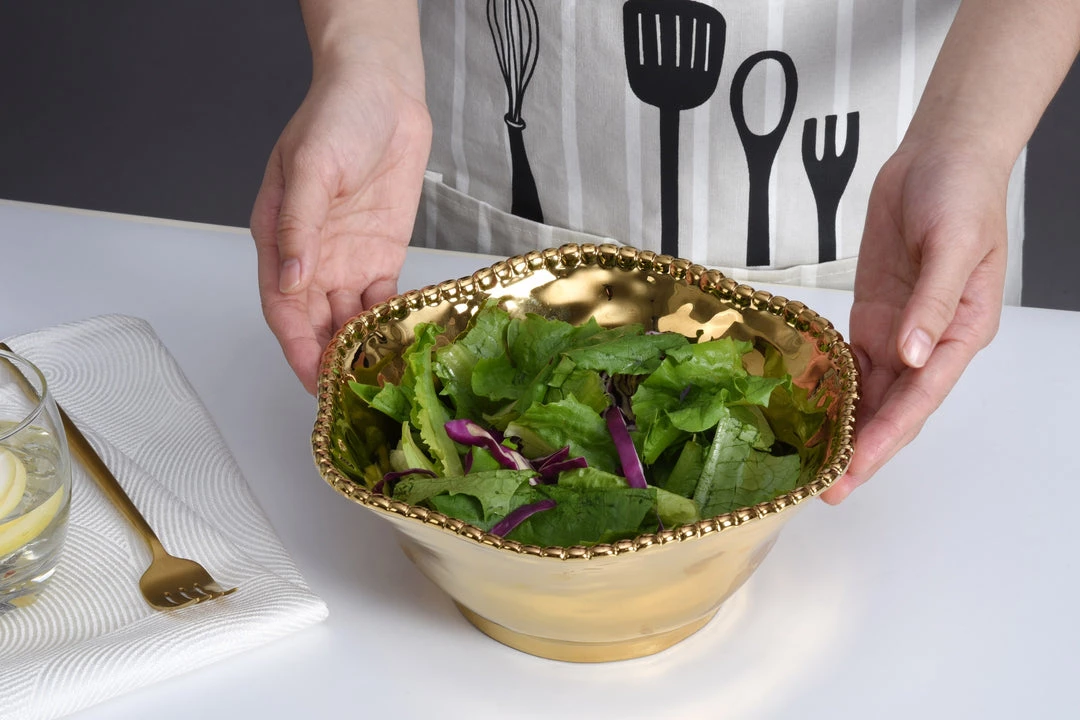 Description: This high quality porcelain is a miracle material! It is food safe, dishwasher safe, and oven safe up to 350 degrees! Made in Argentina, this beautiful porcelain is also tarnish free, scratch/stain resistant, will not lose its beautiful luster, and is perfect for everyday life! Baking and serving never looked so good! This wavy edge beaded salad bow features a beautiful gold shiny finish and is very versatile. Ties back to all of our other beaded porcelain pieces. Comes in 2 sizes, Sold separately.
