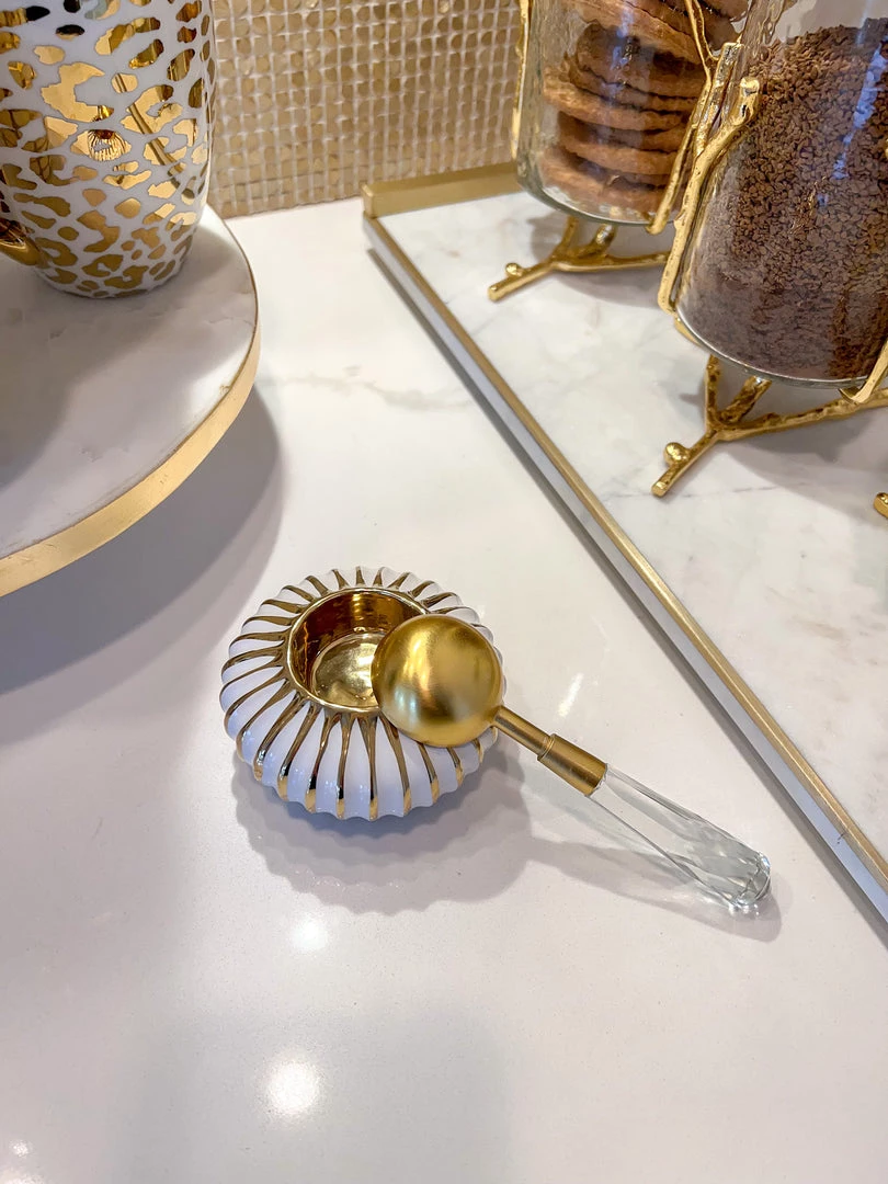 Description: This stunning gold and white teal light holder makes the perfect spoon rest, it can also be used to hold your rings. It is sure to fit into any decor!