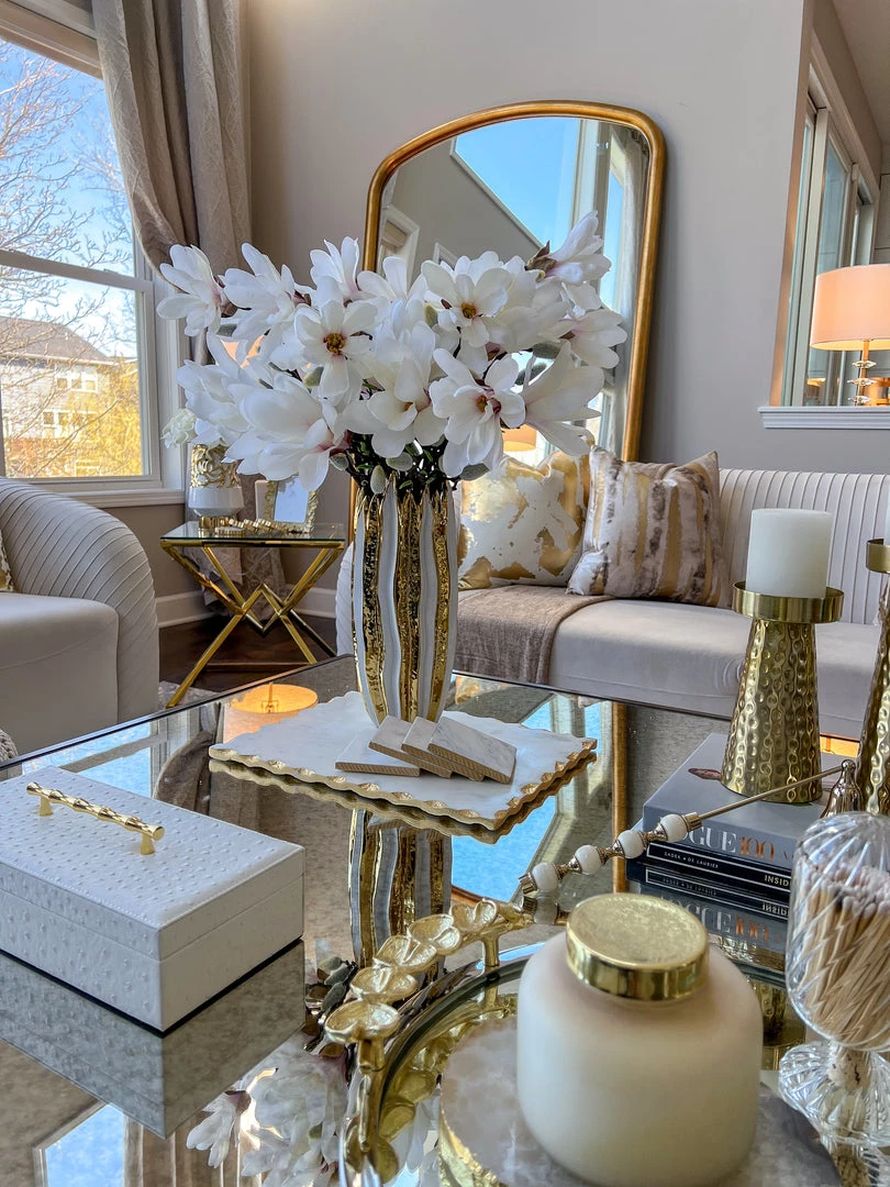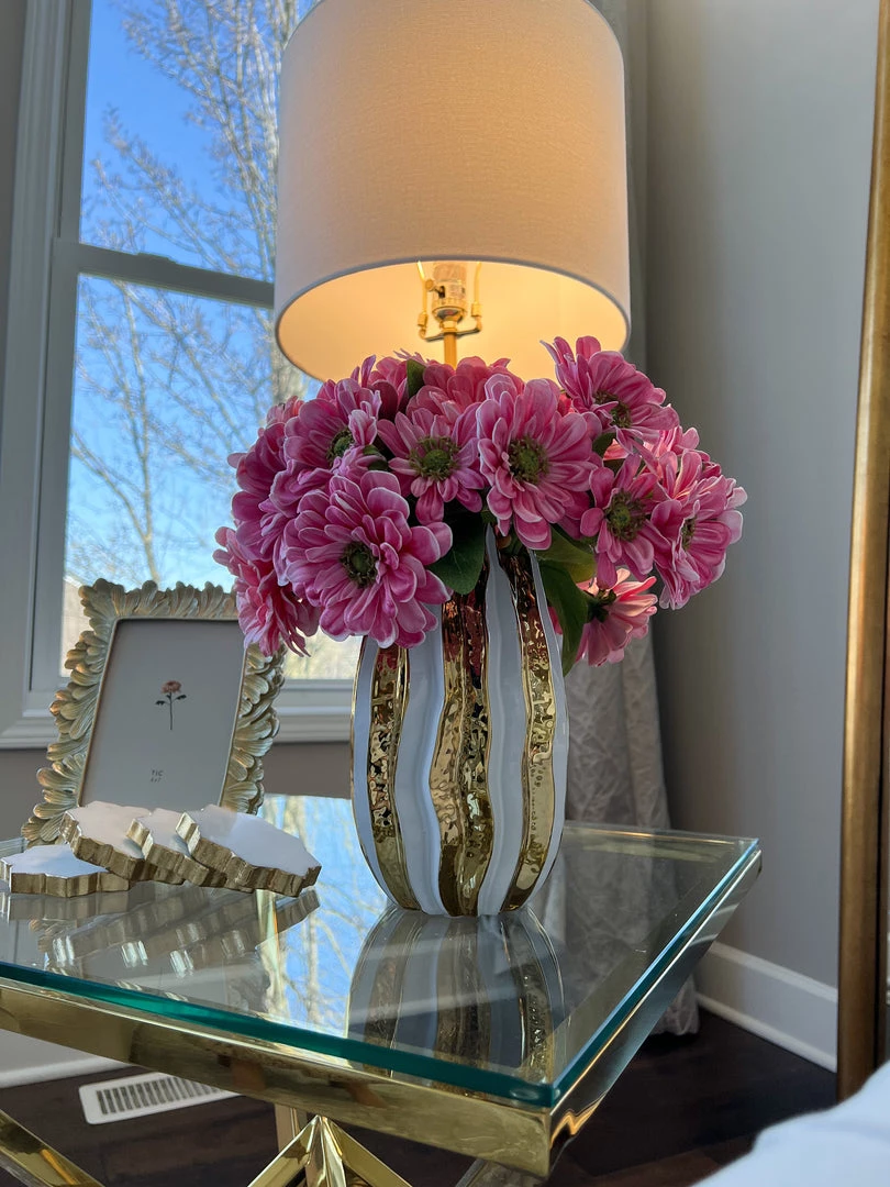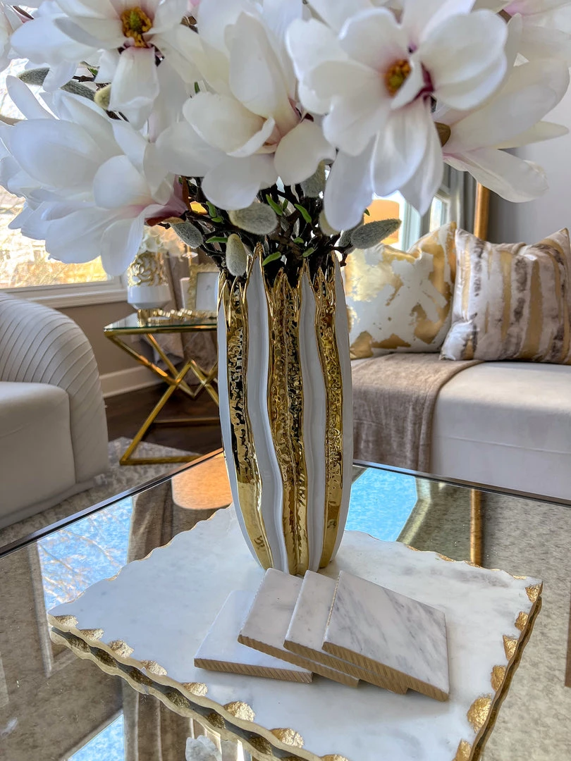 Description: This gold and white striped vase is very detailed at the top and looks absolutely amazing with any color faux floral!
