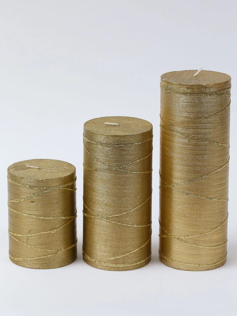 Description: These pillar candle feature a festive gold metallic finish with glitter detailing and are perfect to warm up your home and create an illuminating environment.