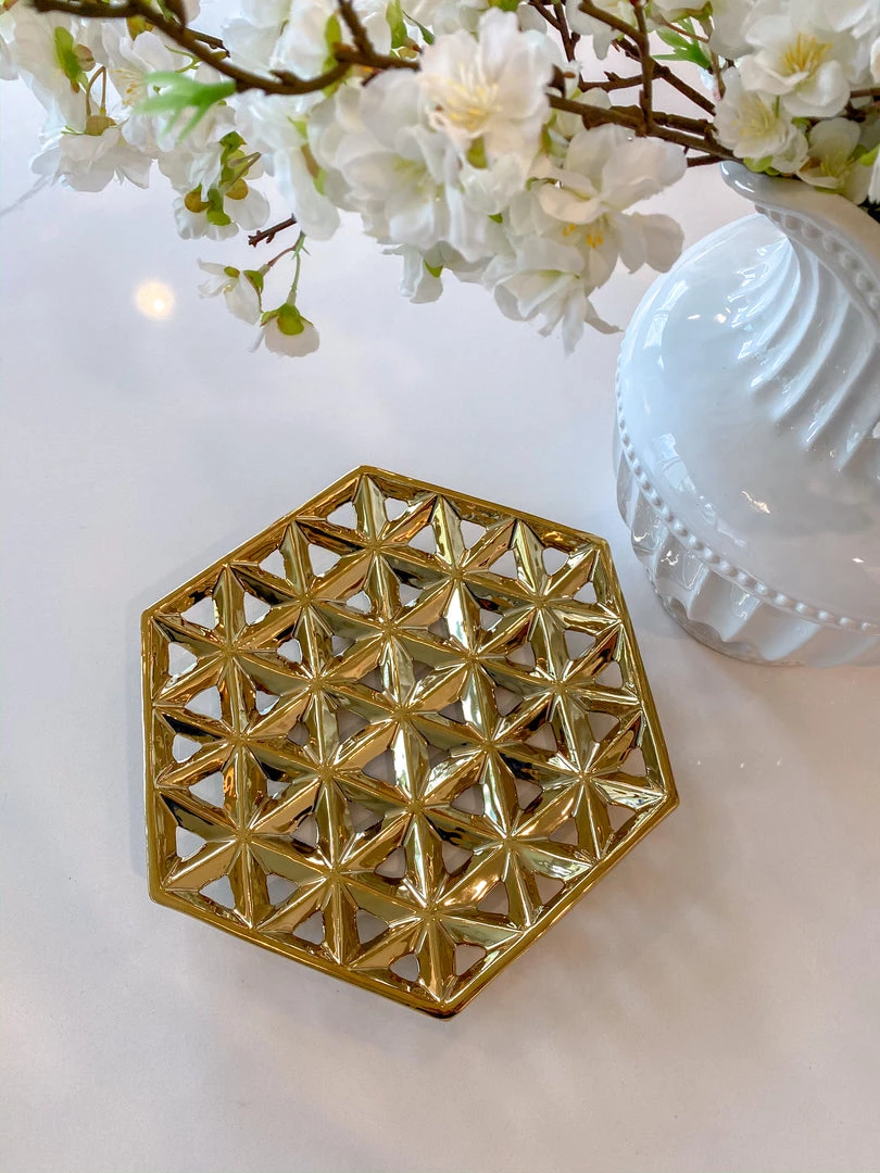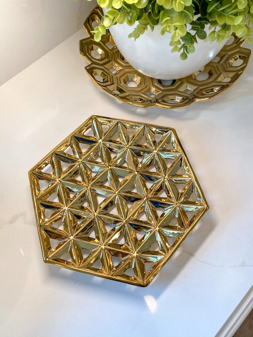 Description: Highlight your dinner plates with this glamorous hexagon shaped charger.