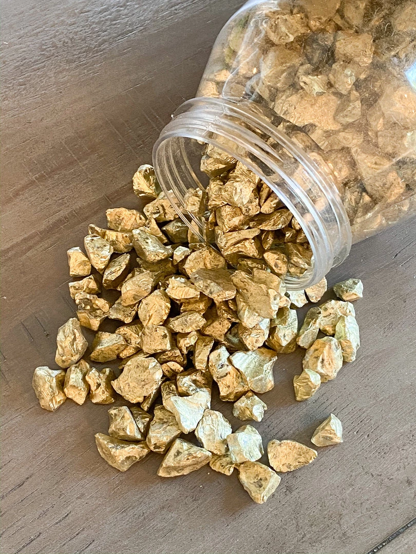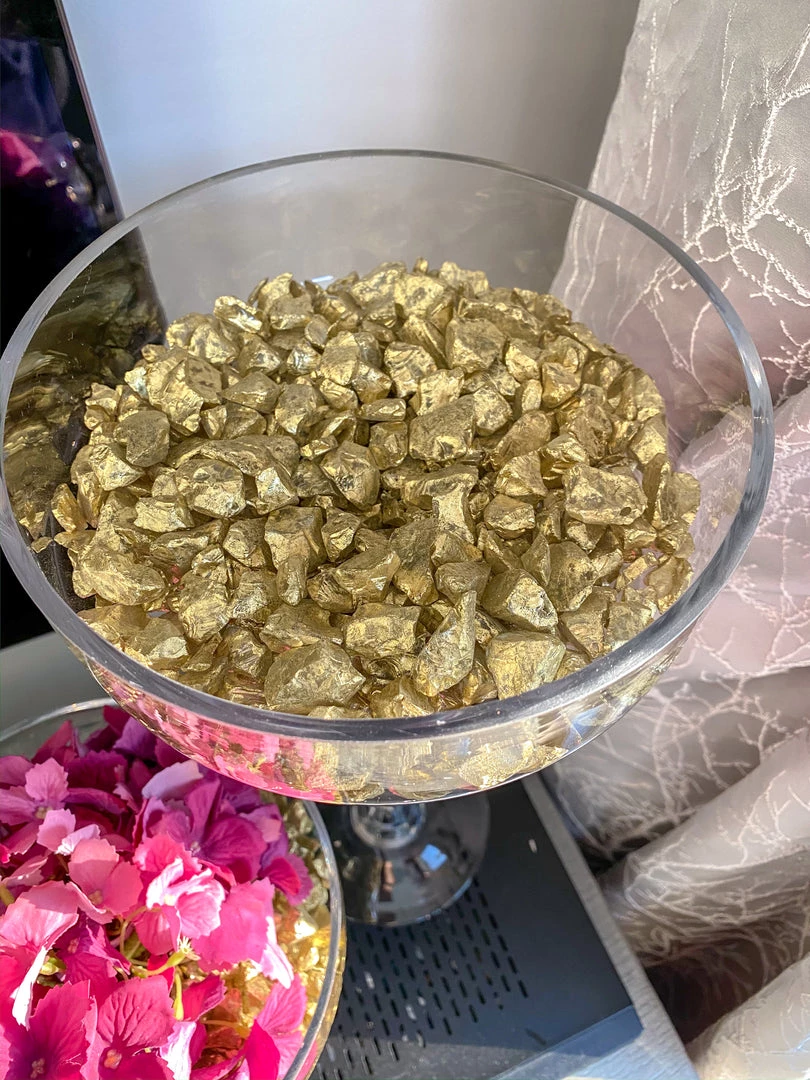 Description: This coarse crushed glass in gold is a perfect filler for any vase, also the perfect component for resin art creations.