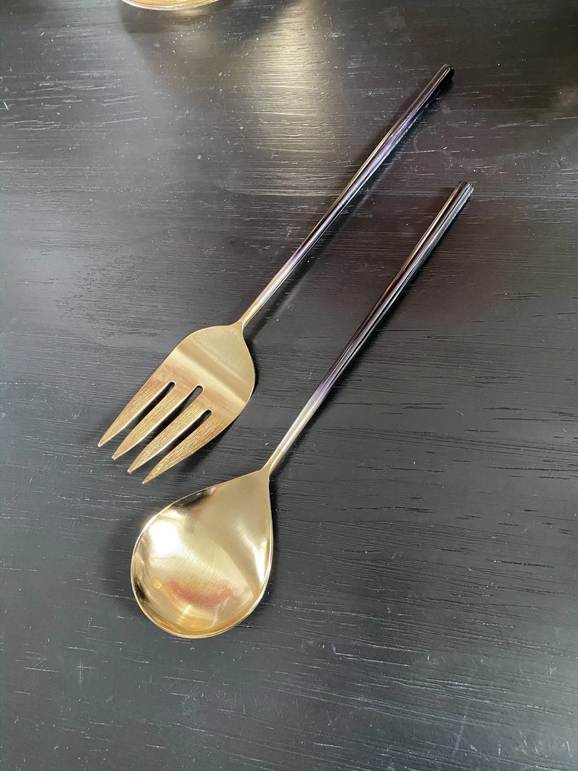 Salad servers with ombre handles and gold servers.