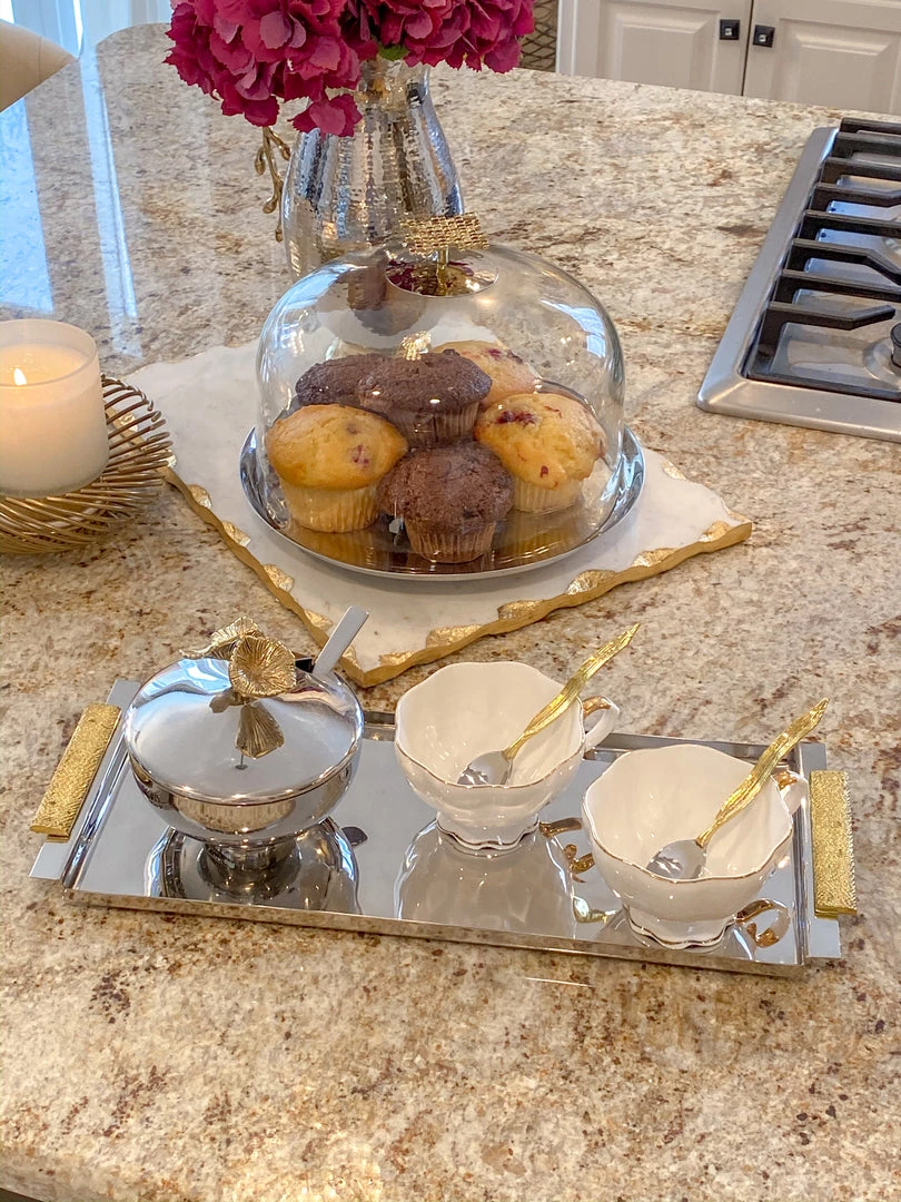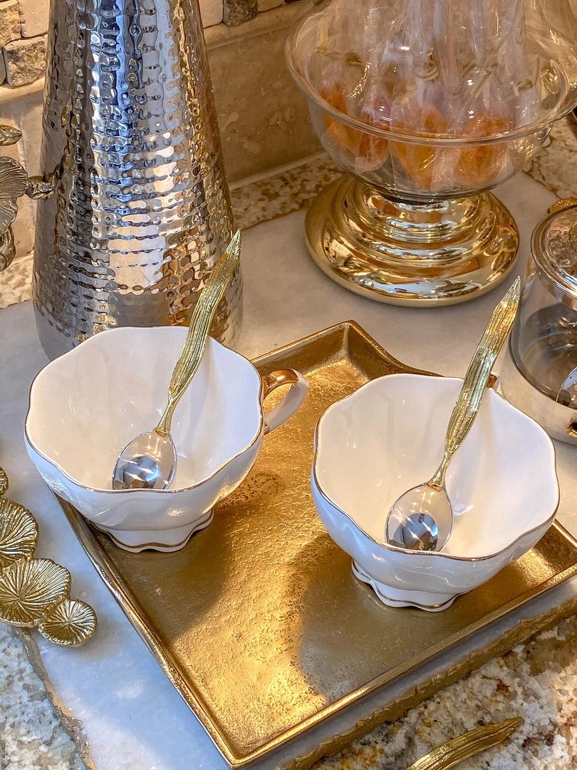 These small gold and silver spoons feature a detailed leaf handle. These are perfect for your coffee, honey, or sugar.