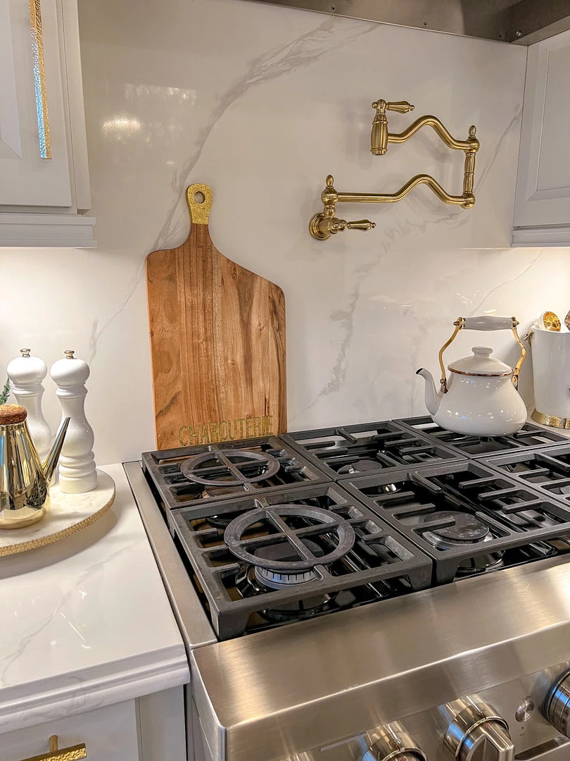Description: This is a beautiful Charcuterie Board with a gold handle and flat edge design. This will add unique styling to your serving display! Stand it up and layer it with other boards!