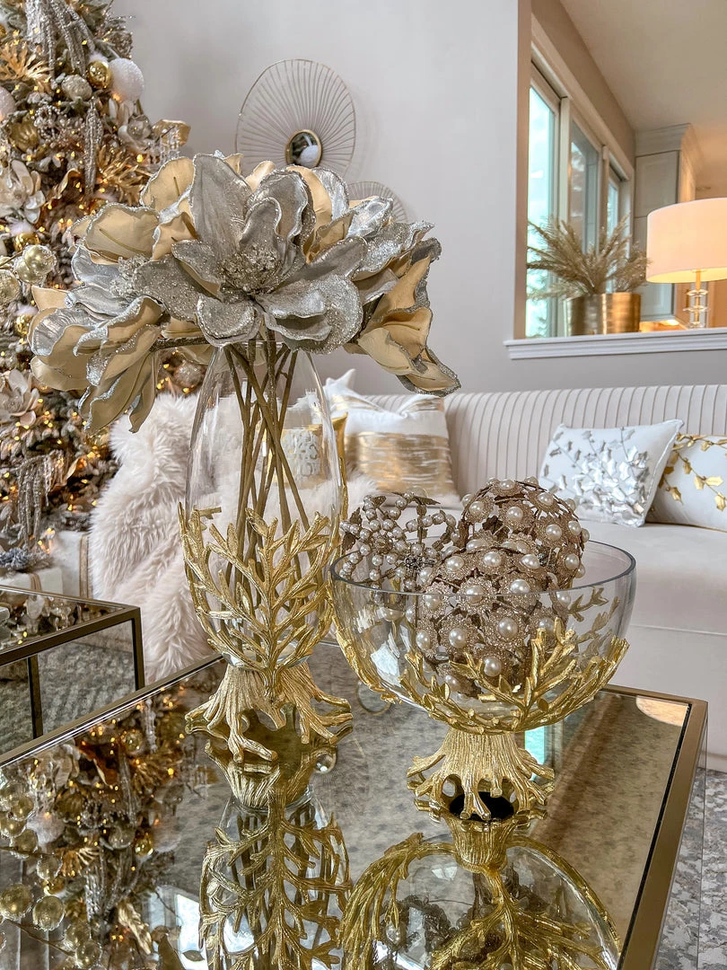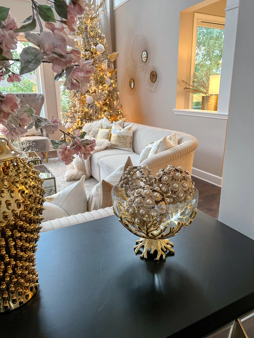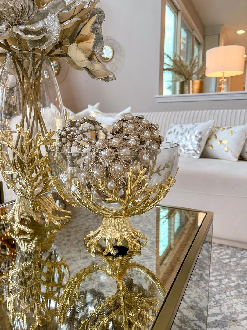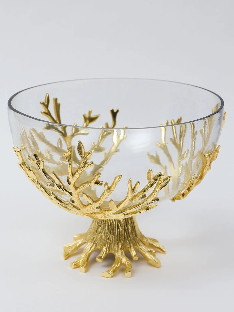 Description: This large glass bowl is perfect for displaying decor or serving meals or snacks! It features a beautiful gold branch base and the bowl is removable for an easy wash!