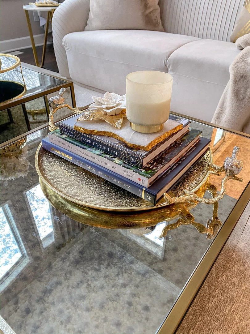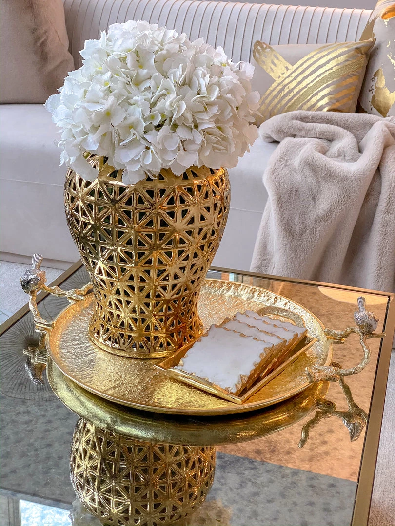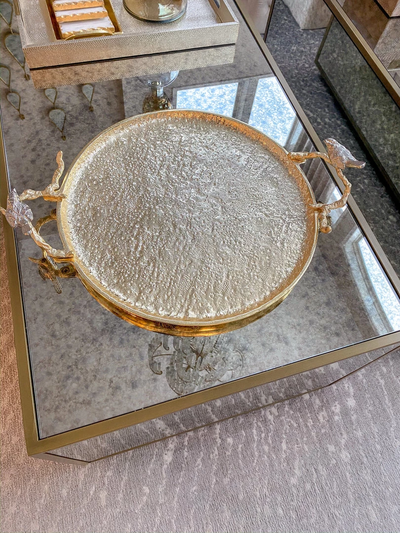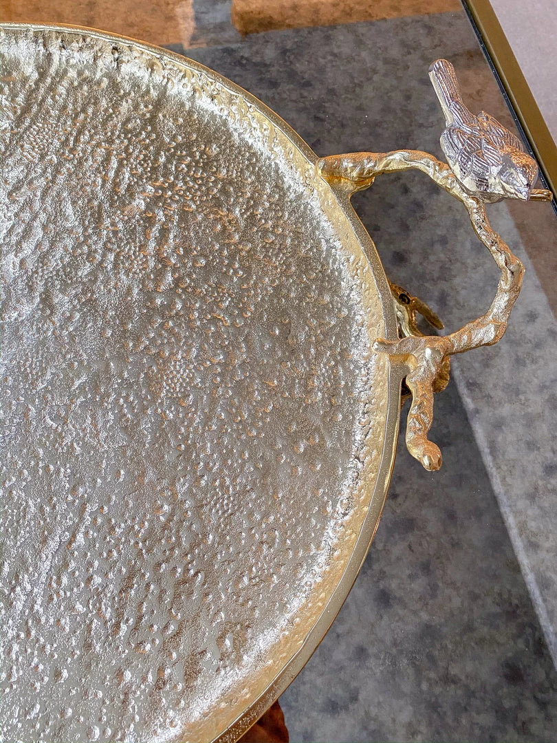 Description: Display your favorite items on this lovely gold tray! Little silver birds rest on the handles, bringing the beauty of nature right into your living room!