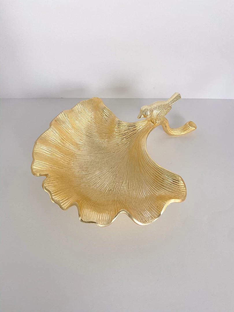 Description: Add natural beauty to your glamorous home decor! This leaf bowl features a small golden bird birched over your favorite fillers and will look stunning in your home!