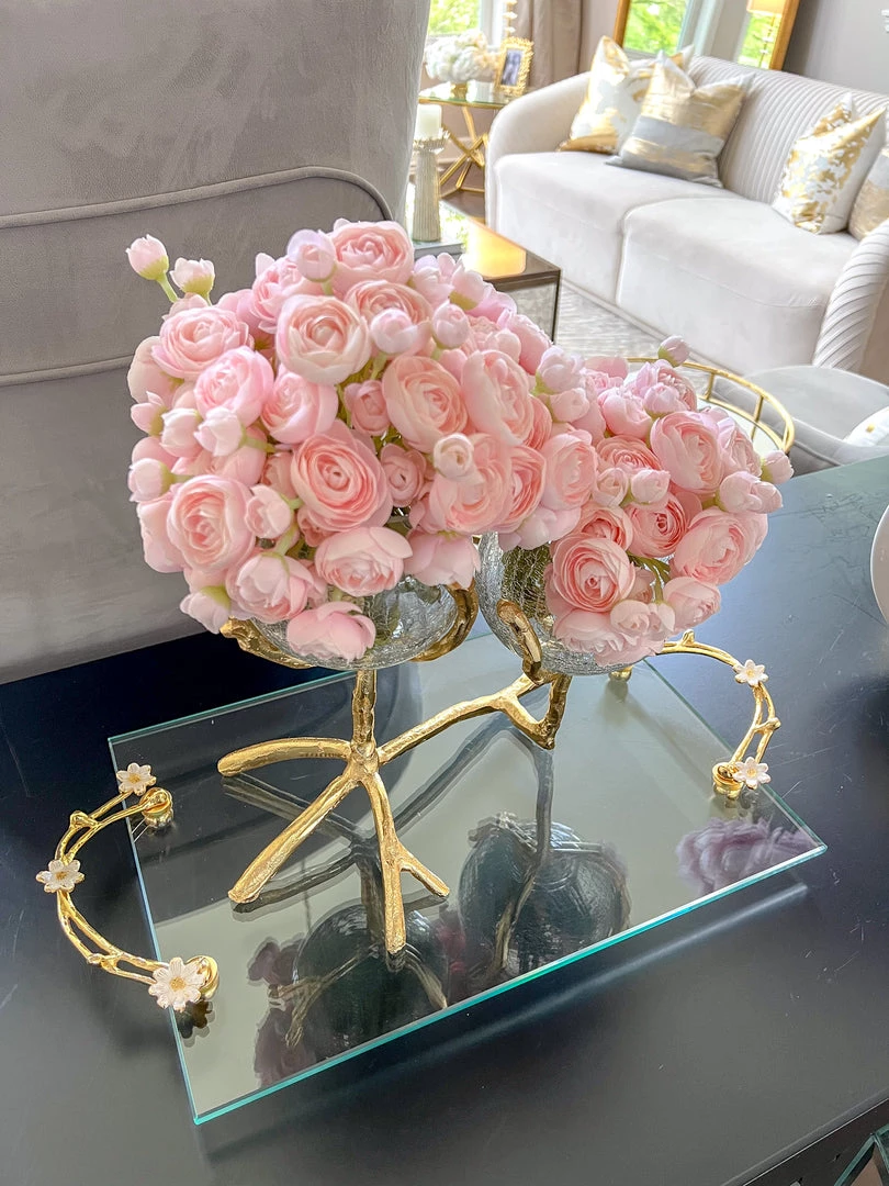 Description: This large rectangular glass tray has stunning gold detail and gold handles with a cherry blossom design!