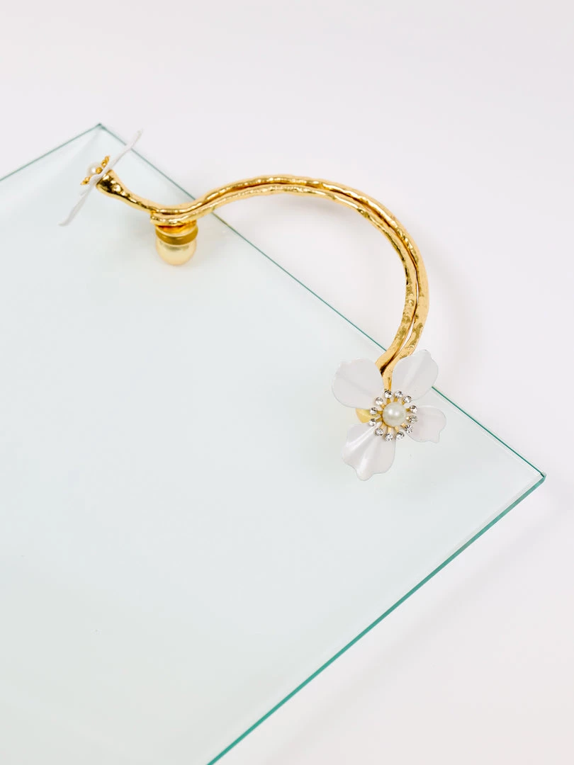 Description: This beautiful rectangular glass tray has stunning gold details with a white jeweled flower design!